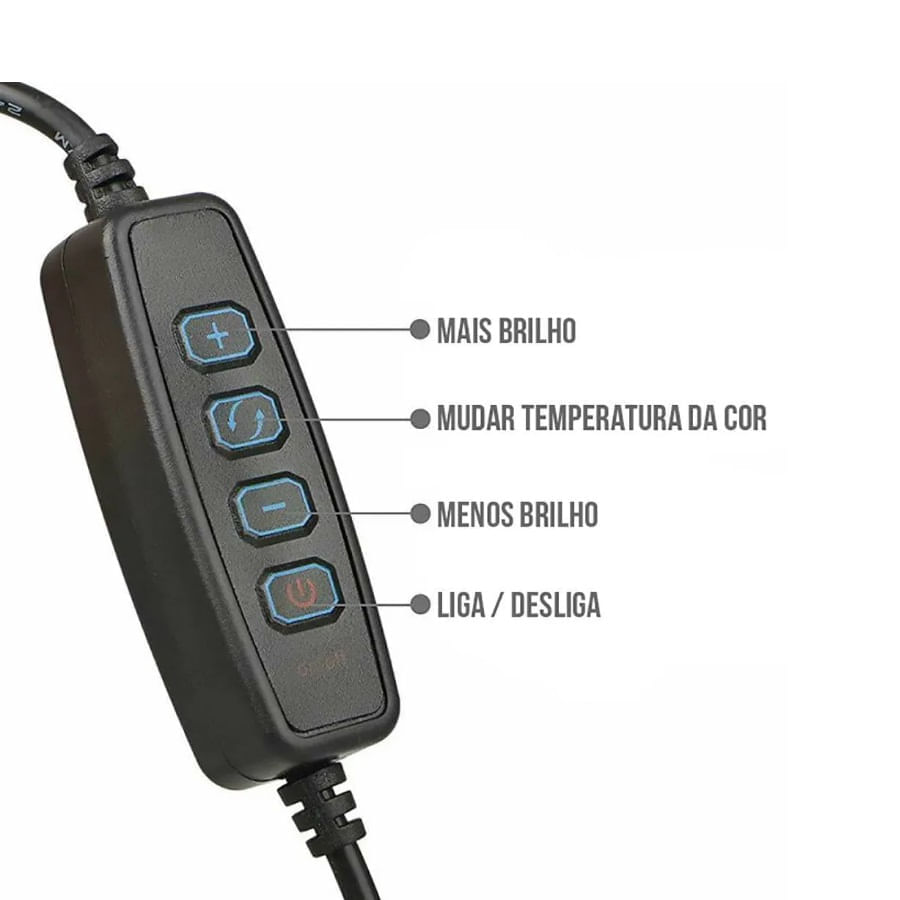 Com Seu Design Elegante E Recursos Avançados, Você Vai Obter Uma Iluminação Suave E Uniforme Que Realça Sua Beleza Natural, Eliminando Sombras Indesejadas, Pois Ele Tem 12 Polegadas E Potência De 10w 800 Lm. Seja Para Transmissões Ao Vivo, Sessões De Maquiagem Ou Produções Profissionais, Esse Ring Light Vai Se Adaptar A Qualquer Tipo De Conteúdo, Graças Ao Seu Controle De Mudança De Cor, Que Permite A Troca Entre 3 Tipos Tonalidades E Intensidades.