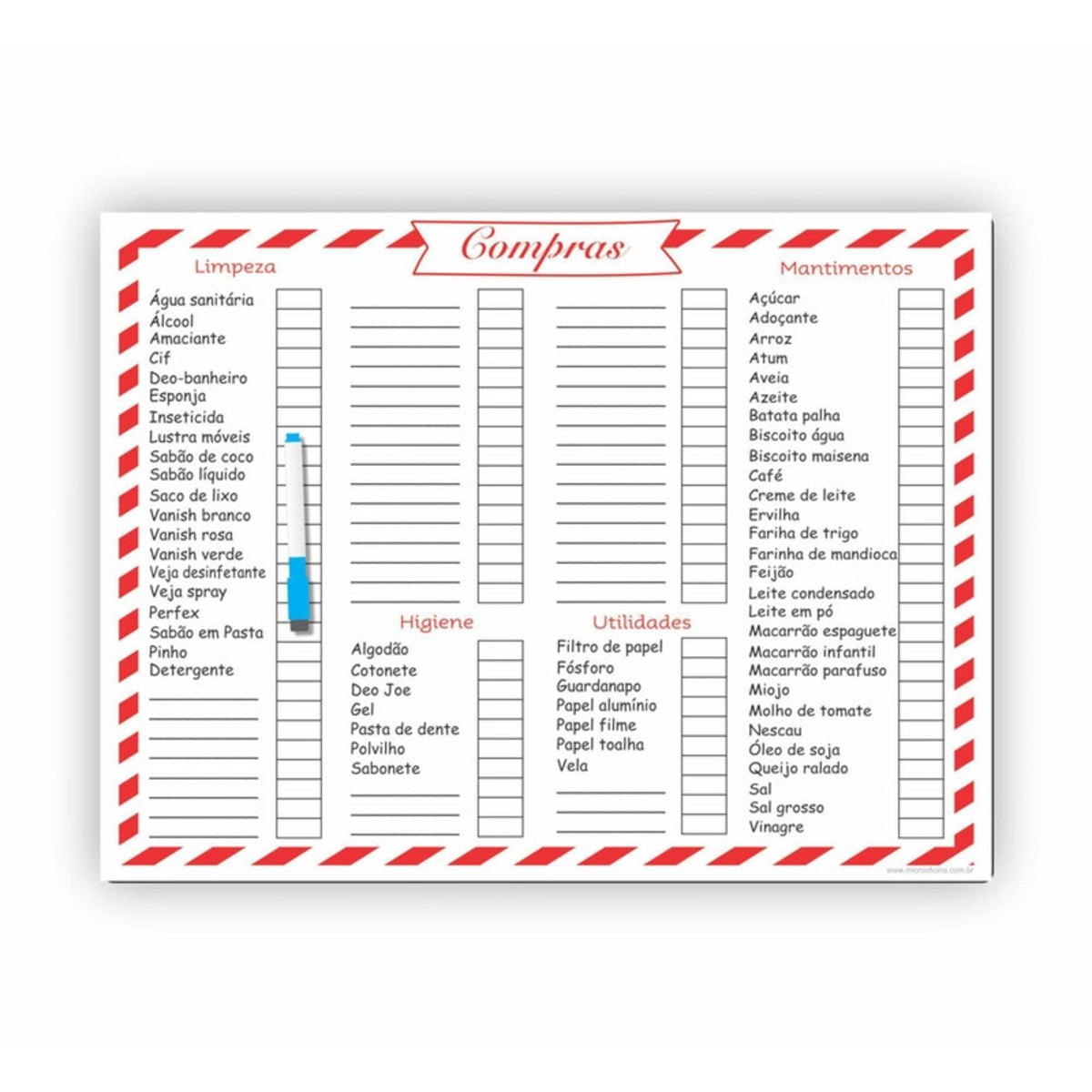 Ímã De Geladeira Planner Lista Compras Vermelho..Os Nossos Imãs para geladeira são impressos com tinta Eco-Solventes com qualidade fotográfica em Vinil Autocolante e depois fixado em uma Manta Magnética com 0,8 mm espessura, ideias para serem fixados em geladeiras. São ideais para quem quer fazer mudanças no ambiente da cozinha de sua casa sem gastar muito, além do seu preço acessível dispensa a contratação de profissionais, já que você mesmo(a) pode fazer a instalação...Quadro magnético para anotações. ..Para uso com marcadores para quadro branco. ..Espessura: 0,08 mm...Medida 40 cm x 30 cm. ..Acompanha uma caneta azul com imã e apagador + recarga azul...Recomendamos limpeza periódica com removedor.