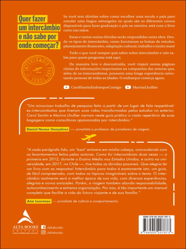 "a Cada Parágrafo Lido, Um ‘isso!’ Entoava Em Minha Cabeça, Concordando Com Os Levantamentos Feitos Pelas Autoras. Como Fui Intercambista Duas Vezes — A Primeira Em 2012, Durante O Ensino Médio Nos Estados Unidos, E Outra Na Universidade, Em 2017, No Chile —, Tive Todas As Dúvidas Possíveis. Que Alegria Ler Um Livro Com As Respostas! Intercâmbio Para Todos É Exatamente Isto: Um Guia, De Fácil Compreensão, Com Todos Os Tópicos Imagináveis Sobre O Tema. O Intercâmbio Realmente Será A Melhor Época De Sua Vida, Com Diversas Experiências, Alegrias E Novas Amizades. Porém, A Viagem Também Aborda Responsabilidade, Autoconhecimento E Extrema Organização. Por Isso, É Tão Importante Um Manual Completo Que Facilite A Vida Do Futuro Viajante E De Sua Família.”