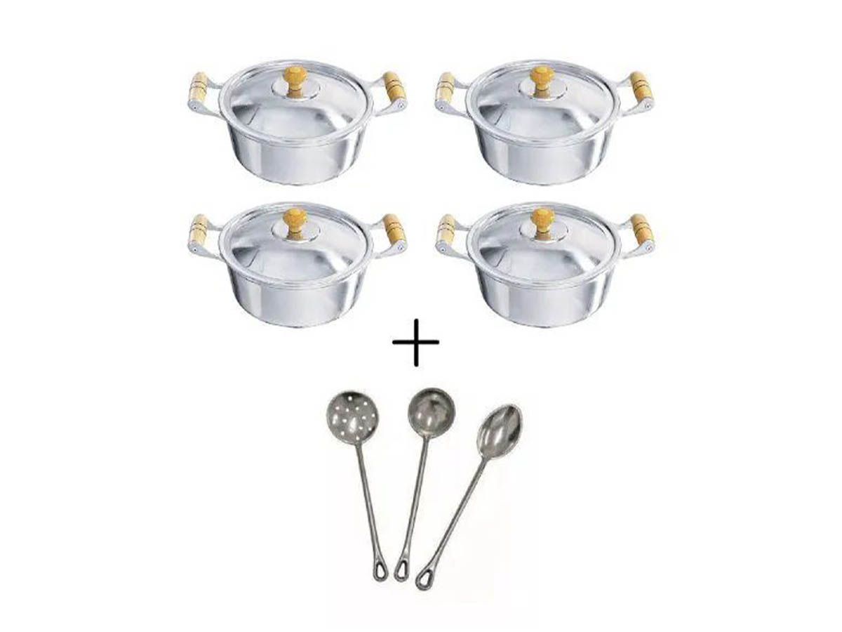 Jogo Caçarolas Alça Madeira Alumínio Fundido PolidaCaçarola Alça Madeira Alumínio Fundido Polida:Todas as nossas panelas são confeccionadas com alumínio maciçode excelente qualidade e elevado grau de pureza, o que impede orisco de trincas e fissuras. Feitas com muito cuidado, nossasalças são fundidas em conjunto com o corpo da panela e revestidaem madeira com belo acabamento finalizada em verniz.Especificação Técnicas Caçarolas:Material: Aluminio Fundido Polido.Caçarola N°16: 16 cm de diâmetro, 7,5 cm Altura, 1,3L.Caçarola N°18: 18 cm de diâmetro, 8 cm Altura, 1,7L.Caçarola N°20: 20 cm de diâmetro, 8,5 cm Altura, 2,3L.Caçarola N°22: 22 cm de diâmetro, 9 cm Altura, 2,9L.TODAS SEGUEM COM TAMPA,Especificações Técnicas:Comprimento: 30cm.Tipo: Espumadeira, Colher e Concha.Peso: 0,65g cada.Itens Inclusos:01 Caçarola Reta Alumínio Polido Alça Madeira 16cm.01 Caçarola Reta Alumínio Polido Alça Madeira 18cm.01 Caçarola Reta Alumínio Polido Alça Madeira 20cm.01 Caçarola Reta Alumínio Polido Alça Madeira 22cm.01 Colher Alumínio Fundido Polido01 Concha Alumínio Fundido Polido01 Espumadeira Alumínio Fundido Polido04 Tampas em Alumínio com Batoque.Código:JGAMPOL16A22