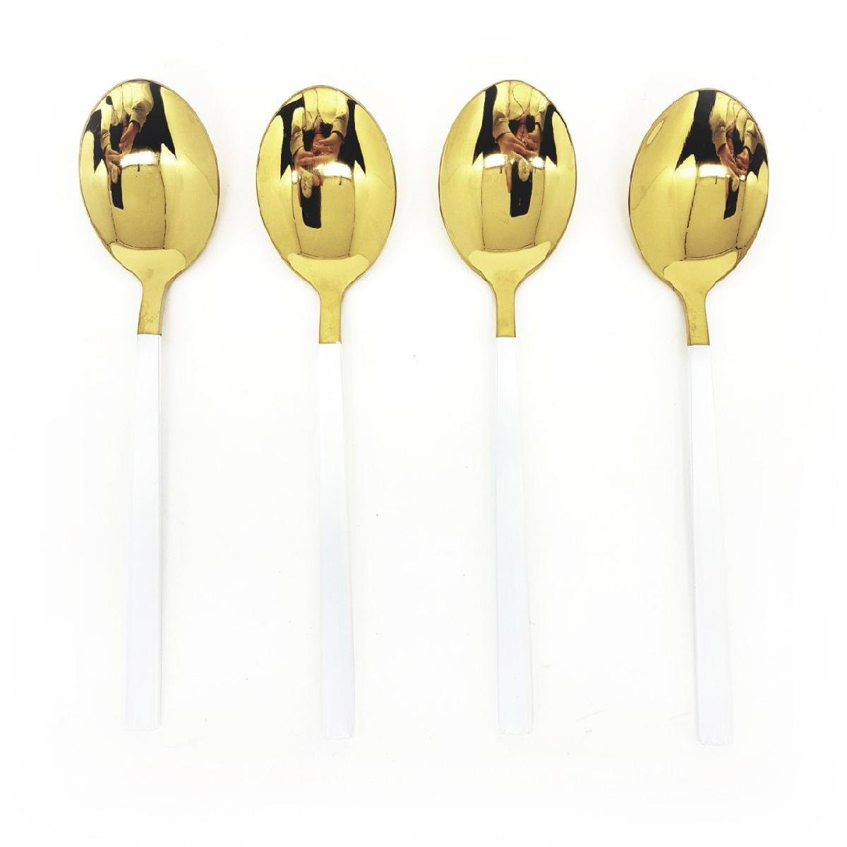 Jogo de Colher Douradas com Cabo Branco 4 peças .....Características Gerais do Produto:.. ¿ Composição e Dimensões: 4 colheres | 19cm. ¿ Material: Aço Inoxidável. ¿ Código do Fabricante: DEC02390. ¿ Informações Adicionais: Lavar com detergente neutro e esponja macia. Não lavar em máquinas.. ¿ Tipo e dimensões da embalagem: Caixa parda | 20x15x15cm | 0,500kg. .Acompanha o produto:.. ¿ 4 Peças