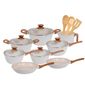 2 Panelas: 16 Cm (1,3 Litros) Com Tampa De Vidro 1 Panela: 20 Cm (2,25 Litros) Com Tampa De Vidro 1 Caçarola: 20 Cm (2,25 Litros) Com Tampa De Vidro 1 Caçarola: 22 Cm (3,25 Litros) Com Tampa De Vidro 1 Leiteira: 14 Cm (2 Litros) 1 Frigideira: 18 Cm (0,75 Litros) 1 Frigideira: 22 Cm (1,45 Litros) 1 Espátula Vazada Em Bambu 1 Colher Vazada Em Bambu 1 Colher Para Arroz Em Bambu