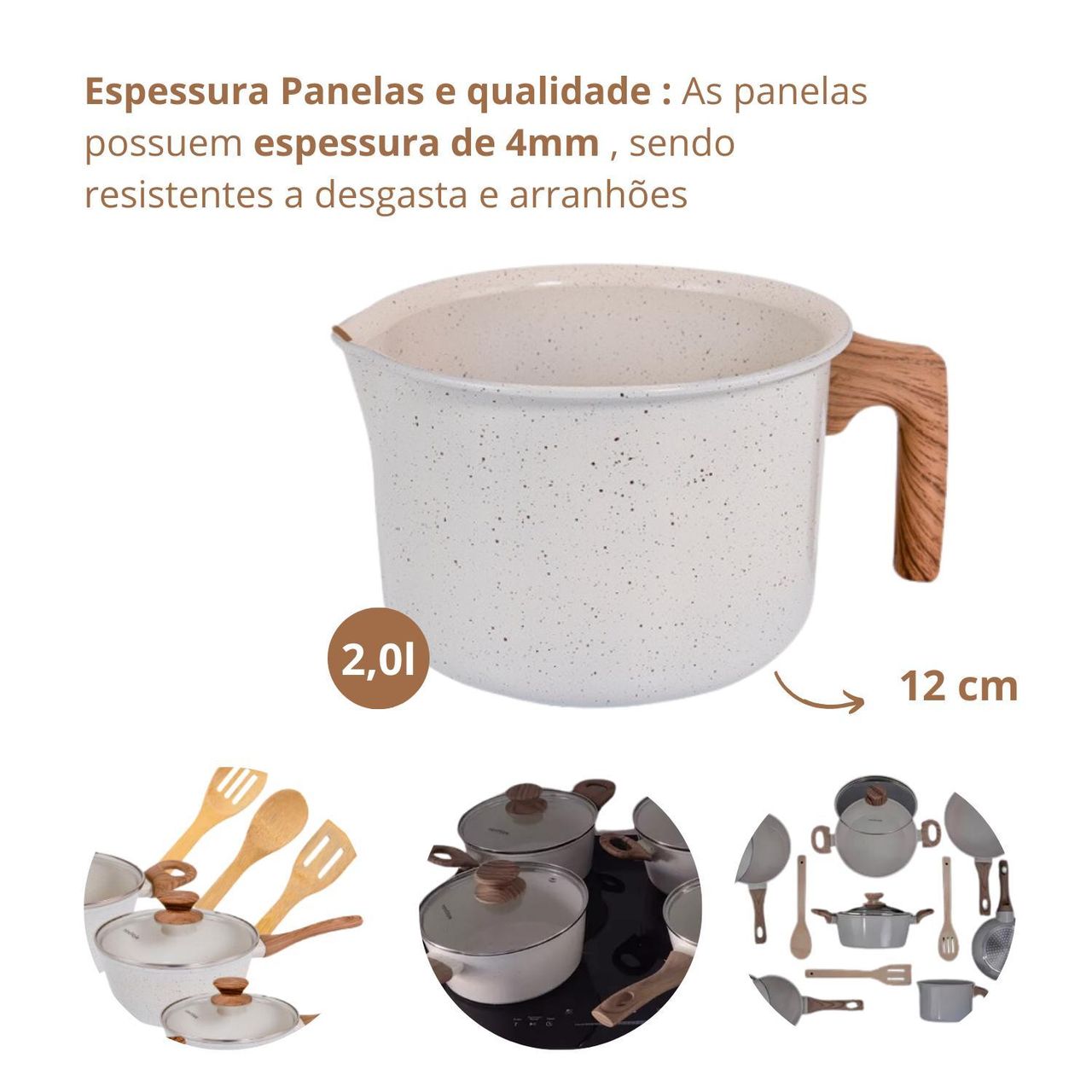 Revestimento: Antiaderente Com 3 Camadas (2 Camadas De Revestimento Cerâmico E 1 Camada Resistente A Alta Temperatura). Espessura: Revestimento 4 Mm / Corpo 2,3 Mm / Fundo 2,7 Mm. Fundo: Triplo Indução Para Eficiência Energética E Cozimento Mais Rápido. Cabo: Em Baquelite Com Revestimento Soft-touch.