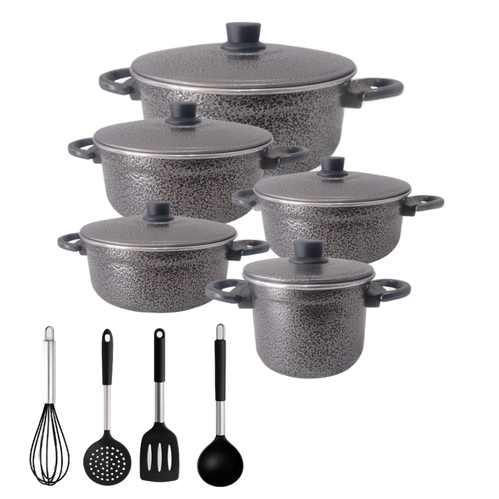 Kit Cozinha Completo Em Alumínio Craqueado + Utensílios Em Silicone E Inox – Estilo, Durabilidade E Praticidade Para O Seu Dia A Dia!