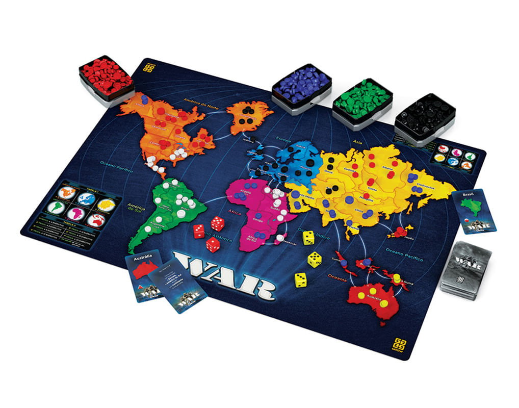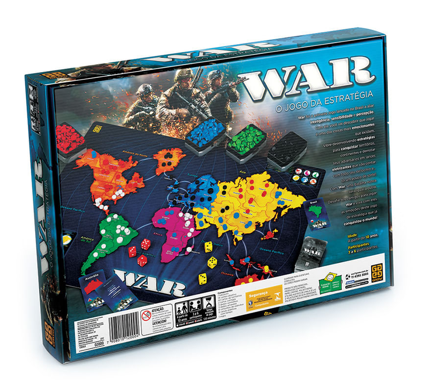 jogo De Tabuleiro - War - Grow: O Melhor Jogo De Estratégia De Todos Os Tempos! Com War, Uma Batalha Nunca É Igual A Outra, E Cada Jogador Precisa Usar Toda Sua Habilidade Militar Para Conquistar Territórios E Continentes E Derrotar Seus Adversários. Sinta-se No Papel De Um Verdadeiro General. Sorteie Seu Objetivo E Defina A Sua Estratégia. Ataque Na Hora Certa, Defenda Seus Territórios E Proteja Suas Fronteiras. Domine Continentes Inteiros, Invada E Conquiste Os Territórios Adversários. Mas Conheça Bem O Poder De Suas Tropas, Pois, Assim Como Nas Grandes Guerras, Ataques Mal Planejados Podem Fazer Grandes Potências Cair, Enquanto Exércitos Menores Podem Virar Poderosos Impérios Se Usarem A Estratégia Certa. Desafie Seus Amigos E Descubra Por Que War É O Jogo De Estratégia Mais Jogado Do Brasil! informações: • Produto: Jogo War • Marca: Grow • Tipo: Jogo De Tabuleiro E Estratégia • Jogadores: De 3 A 6 Participantes • Categoria: Juvenil E Adulto • Tempo Estimado De Jogo: 120 Minutos • Conteúdo: - 01 Tabuleiro - 06 Conjuntos De Fichas De Cores Diferentes - 06 Caixas Plásticas Com Tampas - 14 Cartas-objetivos - 44 Cartas De Territórios - 03 Dados Vermelhos - 03 Dados Amarelos - 01 Manual De Instruções • Recomendação: Para Crianças A Partir De 10 Anos De Idade especificações: • Referência: 02000 • Código De Barras: 7908010120004 • Embalagem (c X A X L): 37.6 X 27.1 X 5.5 Cm • Embalagem (peso): 1.28 Kg • Material / Composição: Papel E Papel Cartão • Registro: Ce-bri/icepex-n 01264-25 • Certificado: Órgãos Autorizados - Ocp´s (organismos De Certificação De Produtos) benefícios De Jogar: • Eleva A Autoestima • Exercita A Memória • Estimula O Raciocínio • Exercita O Imaginário • Desenvolve A Criatividade • Desenvolve Percepção Visual • Desperta A Atenção E Curiosidade • Desenvolvimento Neuropsicológico • Estimula Habilidades Motoras Básicas • Incentiva A Comunicação E Linguagem • Desenvolve Aspectos Emocionais E Afetivo aviso: • As Imagens São Meramente Ilustrativas • Os Pesos, Tamanhos E Medidas São Aproximados • As Cores E Estampas Dos Produtos Podem Ter Variações • As Informações São De Responsabilidade Do Fabricante Ou Fornecedor