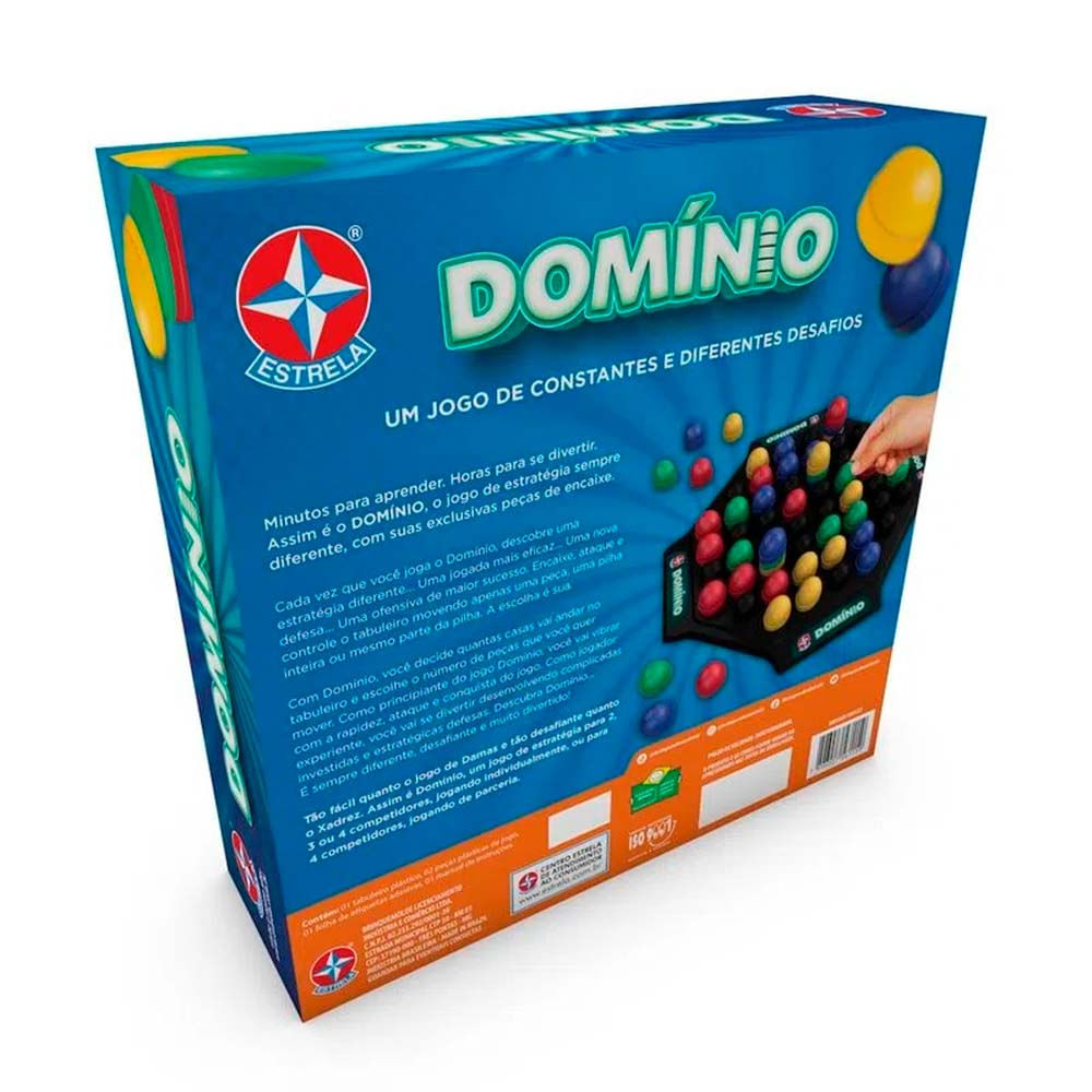 jogo Infantil - Domínio - Estrela: Domínio É Um Jogo De Constantes E Diferentes Objetivos! O Jogador Deve Dominar O Tabuleiro De Tal Forma Que Seu Adversário Não Possa Fazer Nenhum Movimento. Ataque E Controle O Tabuleiro Movendo Apenas Uma Peça, Uma Pilha De Peças Ou Até Mesmo Parte Da Pilha. A Escolha É Sua! informações: • Produto: Domínio • Marca: Estrela • Tipo: Jogo Infantil • Categoria: Jogos E Tabuleiros • Jogadores: Para 2 A 4 Jogadores • Conteúdo: 1 Tabuleiro, 62 Peças, 1 Folha De Etiquetas Adesivas E 1 Manual De Instruções. • Recomendação: Para Crianças A Partir De 06 Anos De Idade especificações: • Referência: 1001603100172 • Código De Barras: 7896027561159 • Embalagem (c X A X L): 31 X 31 X 09 Cm • Embalagem (peso): 0.610 Kg • Material / Composição: Plástico • Registro: 001 801/2020 • Certificado: Órgãos Autorizados - Ocp´s (organismos De Certificação De Produtos) benefícios De Brincar: • Eleva A Autoestima • Exercita A Memória • Estimula O Raciocínio • Exercita O Imaginário • Desenvolve A Criatividade • Desenvolve Percepção Visual • Desperta A Atenção E Curiosidade • Desenvolvimento Neuropsicológico • Estimula Habilidades Motoras Básicas • Incentiva A Comunicação E Linguagem • Desenvolve Aspectos Emocionais E Afetivo • Estimula O Reconhecimento De Formas E Cores aviso: • As Imagens São Meramente Ilustrativas • Os Pesos, Tamanhos E Medidas São Aproximados • As Cores E Estampas Dos Produtos Podem Ter Variações • As Informações São De Responsabilidade Do Fabricante Ou Fornecedor