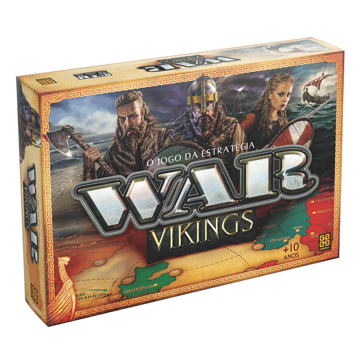 Jogo War Vikings - Grow..O grande jogo da estratégia, agora disputado nos territórios da Escandinávia no século IX! Possui duas opções de regra: a tradicional que todos conhecem, e a avançada, que traz uma mecânica de jogo inédita onde você poderá usar barcos vikings para seus ataques por mar, além dos poderes dos deuses nórdicos Freya, Thor, Odin, Loki e Hela. Traz também miniaturas que simulam os guerreiros, comandantes e barcos para deixar as batalhas mais emocionantes. Sinta-se no papel de um verdadeiro líder Viking. Sorteie seu objetivo e defina a sua estratégia. Ataque na hora certa, defenda seus territórios e proteja suas fronteiras. Domine territórios inteiros, invada e conquiste os territórios adversários. Mas conheça bem o poder de seu exército, pois, assim como nas grandes guerras, ataques mal planejados podem fazer grandes potências cair, enquanto exércitos menores podem virar poderosos impérios se usarem a estratégia certa. Desafie seus amigos para uma emocionante guerra nos territórios nórdicos e torne-se o Rei Viking mais temido e respeitado de toda a Escandinávia!