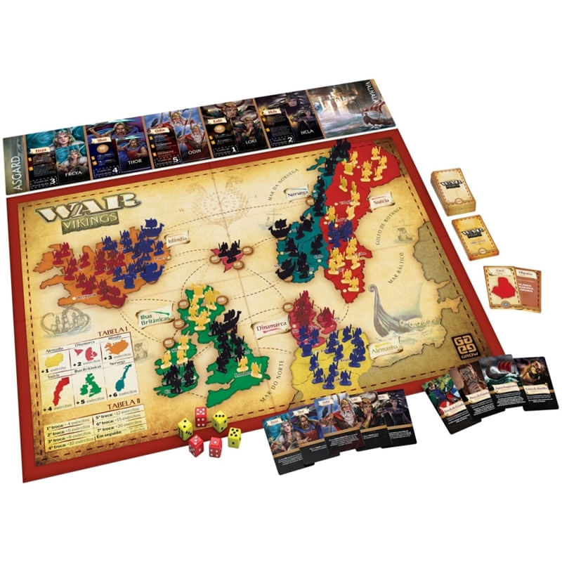 Jogo War Vikings - Grow . O grande jogo da estratégia, agora disputado nos territórios da Escandinávia no século IX! Possui duas opções de regra: a tradicional que todos conhecem, e a avançada, que traz uma mecânica de jogo inédita onde você poderá usar barcos vikings para seus ataques por mar, além dos poderes dos deuses nórdicos Freya, Thor, Odin, Loki e Hela. Traz também miniaturas que simulam os guerreiros, comandantes e barcos para deixar as batalhas mais emocionantes. Sinta-se no papel de um verdadeiro líder Viking. Sorteie seu objetivo e defina a sua estratégia. Ataque na hora certa, defenda seus territórios e proteja suas fronteiras. Domine territórios inteiros, invada e conquiste os territórios adversários. Mas conheça bem o poder de seu exército, pois, assim como nas grandes guerras, ataques mal planejados podem fazer grandes potências cair, enquanto exércitos menores podem virar poderosos impérios se usarem a estratégia certa. Desafie seus amigos para uma emocionante guerra nos territórios nórdicos e torne-se o Rei Viking mais temido e respeitado de toda a Escandinávia!
