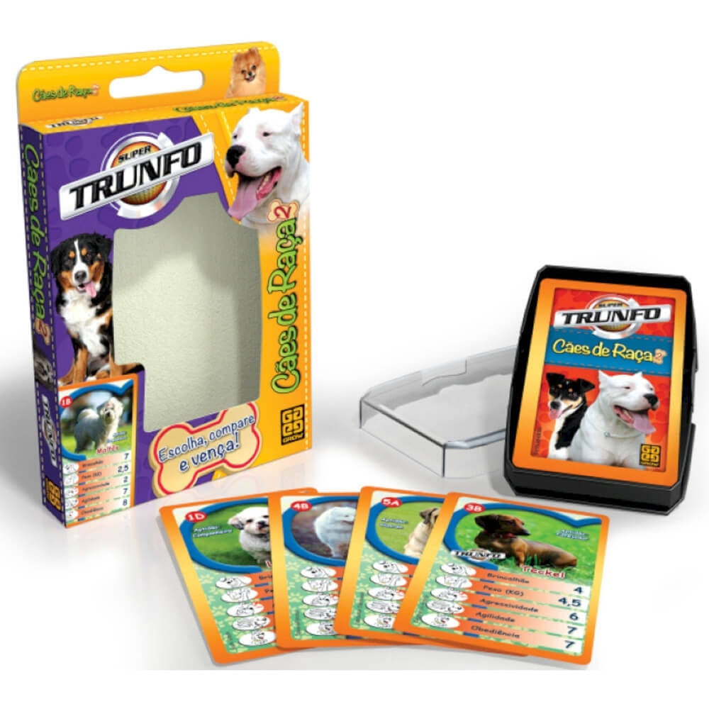 JOGO DE CARTAS - SUPER TRUNFO - CÃES DE RAÇA 2 - GROW: O Super Trunfo Cães de Raça 2 traz mais 32 cartas com fotos e informações muito legais sobre o melhor amigo do homem. Em qual item o cão da sua carta é o melhor? Será ele o mais obediente? O mais agressivo? Ou você tem o Super Trunfo? Escolha, compare e vença essa emocionante disputa.