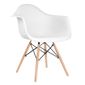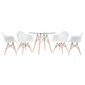 CADEIRAS: Cadeira modelo Eames DAW: Material do assento: Polipropileno - Material da base: Madeira e aço - Altura do encosto: 79,5 cm - Altura do assento: 44 cm - Altura dos braços: 67 cm - Largura total: 62 cm - Peso suportado: 100 kg. MESA: Material do tampo: Vidro incolor temperado 8 mm - Material da base: Madeira e aço - Altura: 75 cm - Diâmetro do tampo: 100 cm - Garantia: 3 meses.