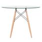 CADEIRAS: Cadeira modelo Eames DAW: Material do assento: Polipropileno - Material da base: Madeira e aço - Altura do encosto: 79,5 cm - Altura do assento: 44 cm - Altura dos braços: 67 cm - Largura total: 62 cm - Peso suportado: 100 kg. MESA: Material do tampo: Vidro incolor temperado 8 mm - Material da base: Madeira e aço - Altura: 75 cm - Diâmetro do tampo: 100 cm - Garantia: 3 meses.