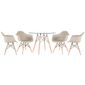 CADEIRAS: Cadeira modelo Eames DAW: Material do assento: Polipropileno - Material da base: Madeira e aço - Altura do encosto: 79,5 cm - Altura do assento: 44 cm - Altura dos braços: 67 cm - Largura total: 62 cm - Peso suportado: 100 kg. MESA: Material do tampo: Vidro incolor temperado 8 mm - Material da base: Madeira e aço - Altura: 75 cm - Diâmetro do tampo: 100 cm - Garantia: 3 meses.