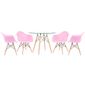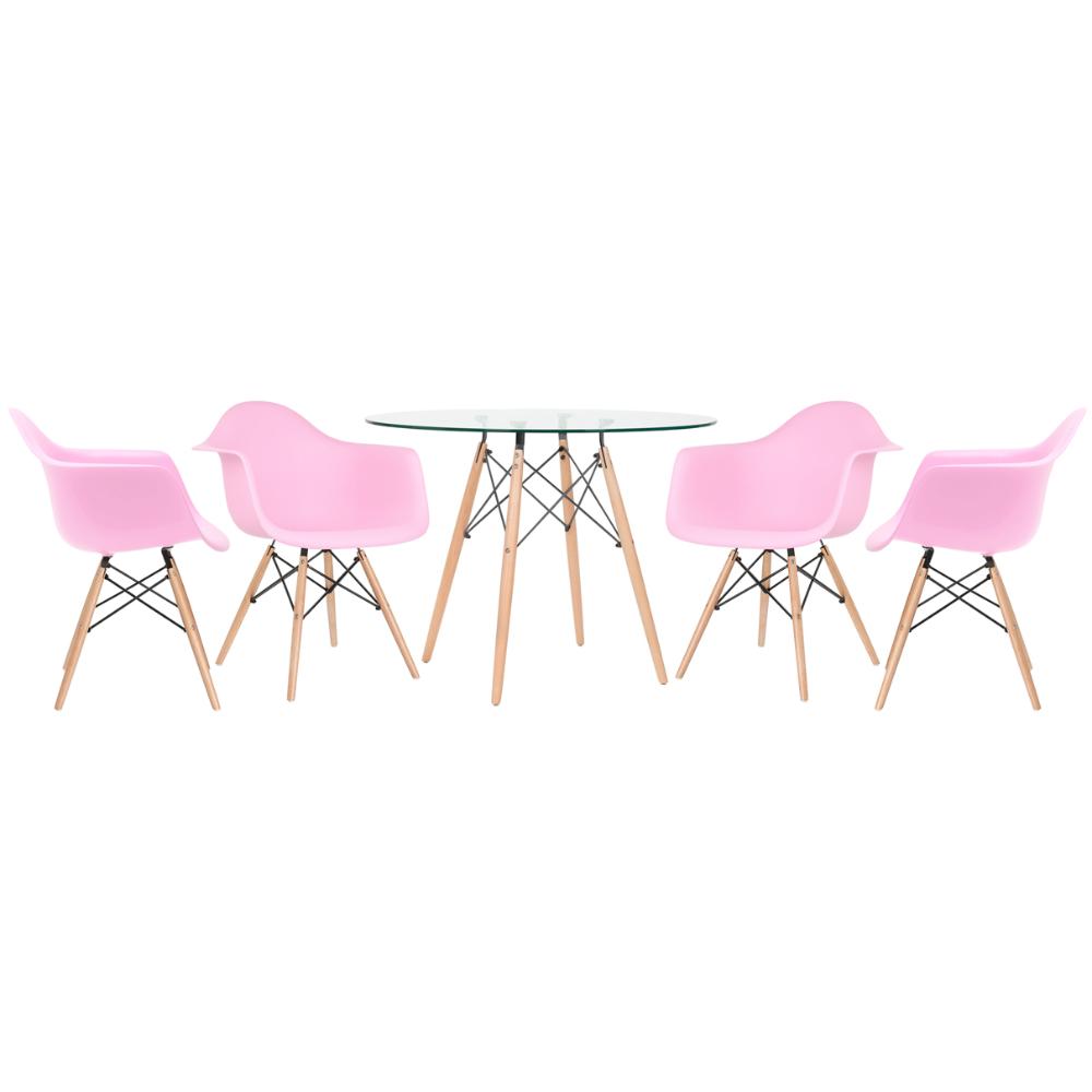 CADEIRAS: Cadeira modelo Eames DAW: Material do assento: Polipropileno - Material da base: Madeira e aço - Altura do encosto: 79,5 cm - Altura do assento: 44 cm - Altura dos braços: 67 cm - Largura total: 62 cm - Peso suportado: 100 kg. MESA: Material do tampo: Vidro incolor temperado 8 mm - Material da base: Madeira e aço - Altura: 75 cm - Diâmetro do tampo: 100 cm - Garantia: 3 meses.