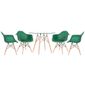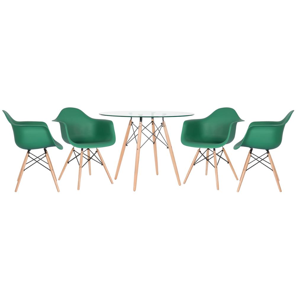 CADEIRAS: Cadeira modelo Eames DAW: Material do assento: Polipropileno - Material da base: Madeira e aço - Altura do encosto: 79,5 cm - Altura do assento: 44 cm - Altura dos braços: 67 cm - Largura total: 62 cm - Peso suportado: 100 kg. MESA: Material do tampo: Vidro incolor temperado 8 mm - Material da base: Madeira e aço - Altura: 75 cm - Diâmetro do tampo: 100 cm - Garantia: 3 meses.