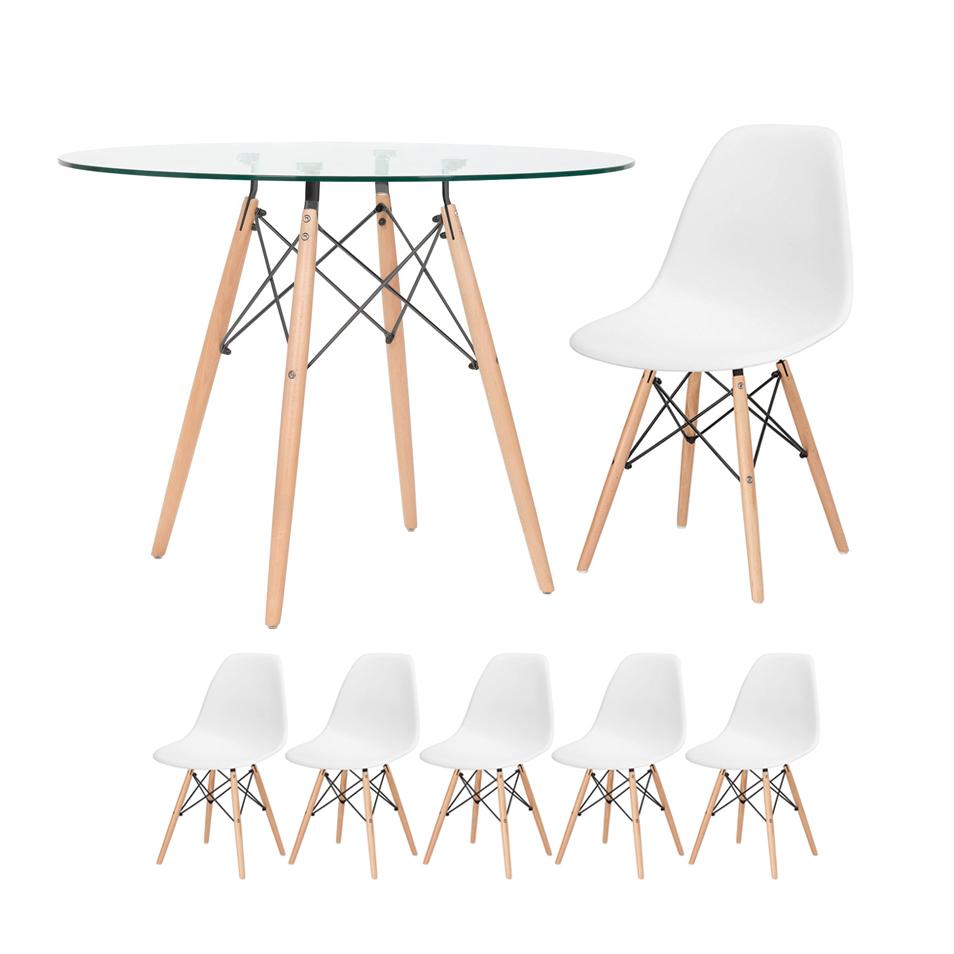 CADEIRAS: Material do assento: Polipropileno - Material da base: Madeira e aço - Altura do encosto: 82 cm - Altura do assento: 42 cm - Largura do assento: 46 cm - Profundidade do assento: 40 cm - Largura total: 46 cm - Profundidade total: 54 cm - Distância entre os pés: 40 cm - Peso suportado: 130 kg. MESA: Material do tampo: Vidro incolor temperado 8 mm - Material da base: Madeira e aço - Altura: 75 cm - Diâmetro: 100 cm - Garantia: 3 meses.