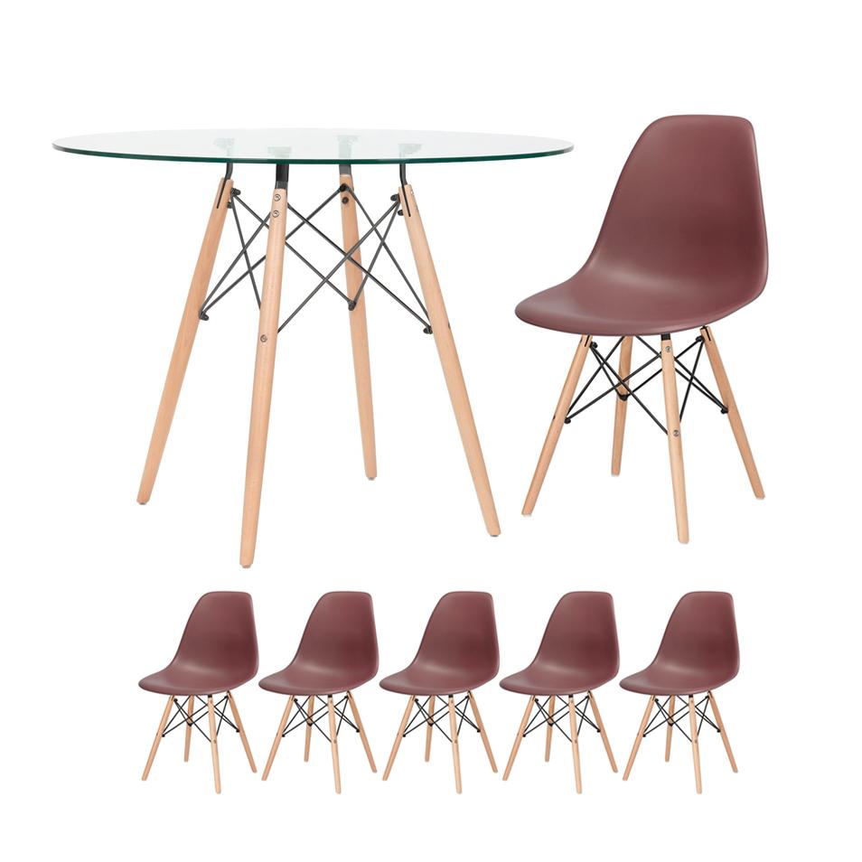 CADEIRAS: Material do assento: Polipropileno - Material da base: Madeira e aço - Altura do encosto: 82 cm - Altura do assento: 42 cm - Largura do assento: 46 cm - Profundidade do assento: 40 cm - Largura total: 46 cm - Profundidade total: 54 cm - Distância entre os pés: 40 cm - Peso suportado: 130 kg. MESA: Material do tampo: Vidro incolor temperado 8 mm - Material da base: Madeira e aço - Altura: 75 cm - Diâmetro: 100 cm - Garantia: 3 meses.