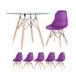CADEIRAS: Material do assento: Polipropileno - Material da base: Madeira e aço - Altura do encosto: 82 cm - Altura do assento: 42 cm - Largura do assento: 46 cm - Profundidade do assento: 40 cm - Largura total: 46 cm - Profundidade total: 54 cm - Distância entre os pés: 40 cm - Peso suportado: 130 kg. MESA: Material do tampo: Vidro incolor temperado 8 mm - Material da base: Madeira e aço - Altura: 75 cm - Diâmetro: 100 cm - Garantia: 3 meses.