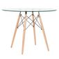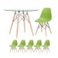 CADEIRAS: Material do assento: Polipropileno - Material da base: Madeira e aço - Altura do encosto: 82 cm - Altura do assento: 42 cm - Largura do assento: 46 cm - Profundidade do assento: 40 cm - Largura total: 46 cm - Profundidade total: 54 cm - Distância entre os pés: 40 cm - Peso suportado: 130 kg. MESA: Material do tampo: Vidro incolor temperado 8 mm - Material da base: Madeira e aço - Altura: 75 cm - Diâmetro: 100 cm - Garantia: 3 meses.