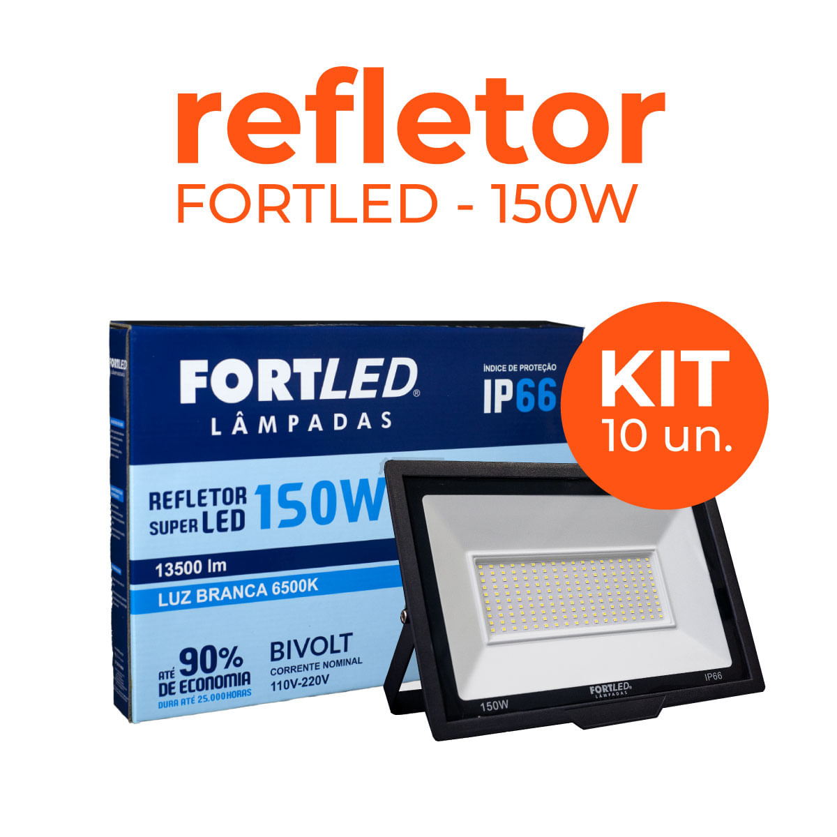 O KIT 10 Refletores de LED 150W Fortled é uma excelente opção para iluminar o exterior da sua casa, desde garagem até jardim! Possuindo o selo de proteção IP66, o Refletor Fortled é totalmente protegido contra a penetração de poeira e a prova de água.