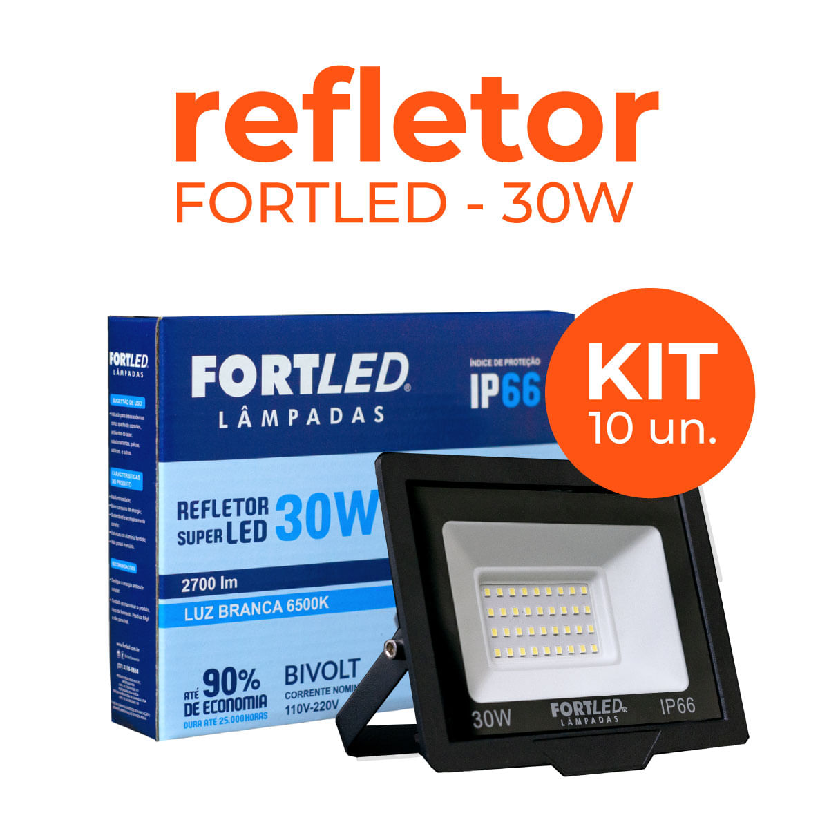 O KIT 10 Refletores de LED 30W Fortled é uma excelente opção para iluminar o exterior da sua casa, desde garagem até jardim! Possuindo o selo de proteção IP66, o Refletor Fortled é totalmente protegido contra a penetração de poeira e a prova de água.
