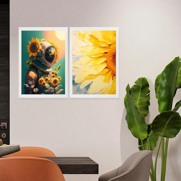 Kit 2 Quadros Astronauta E Girassois 45x34cm