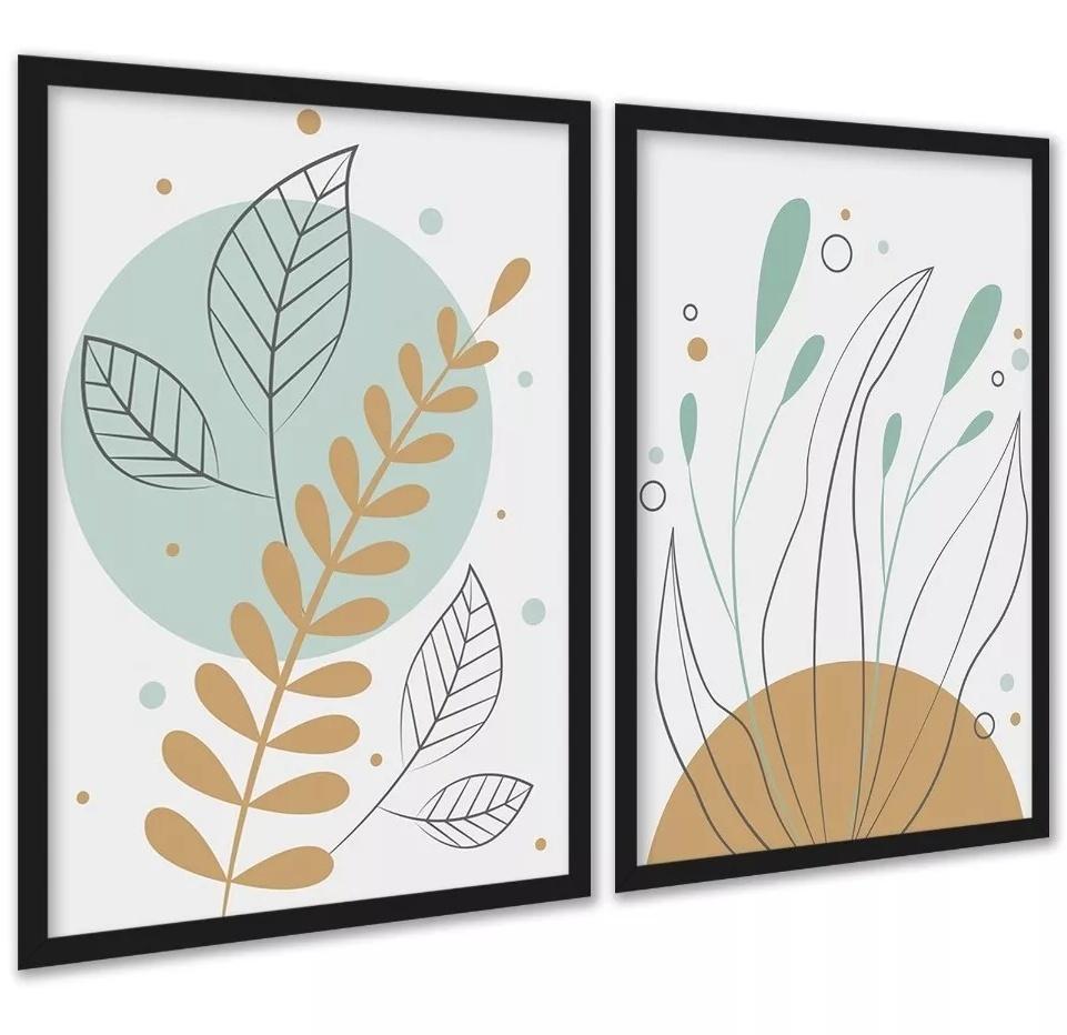 Kit 2 Quadros Boho Plantas Tons Pastéis Verde 45x34cm