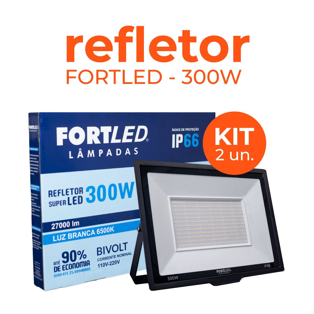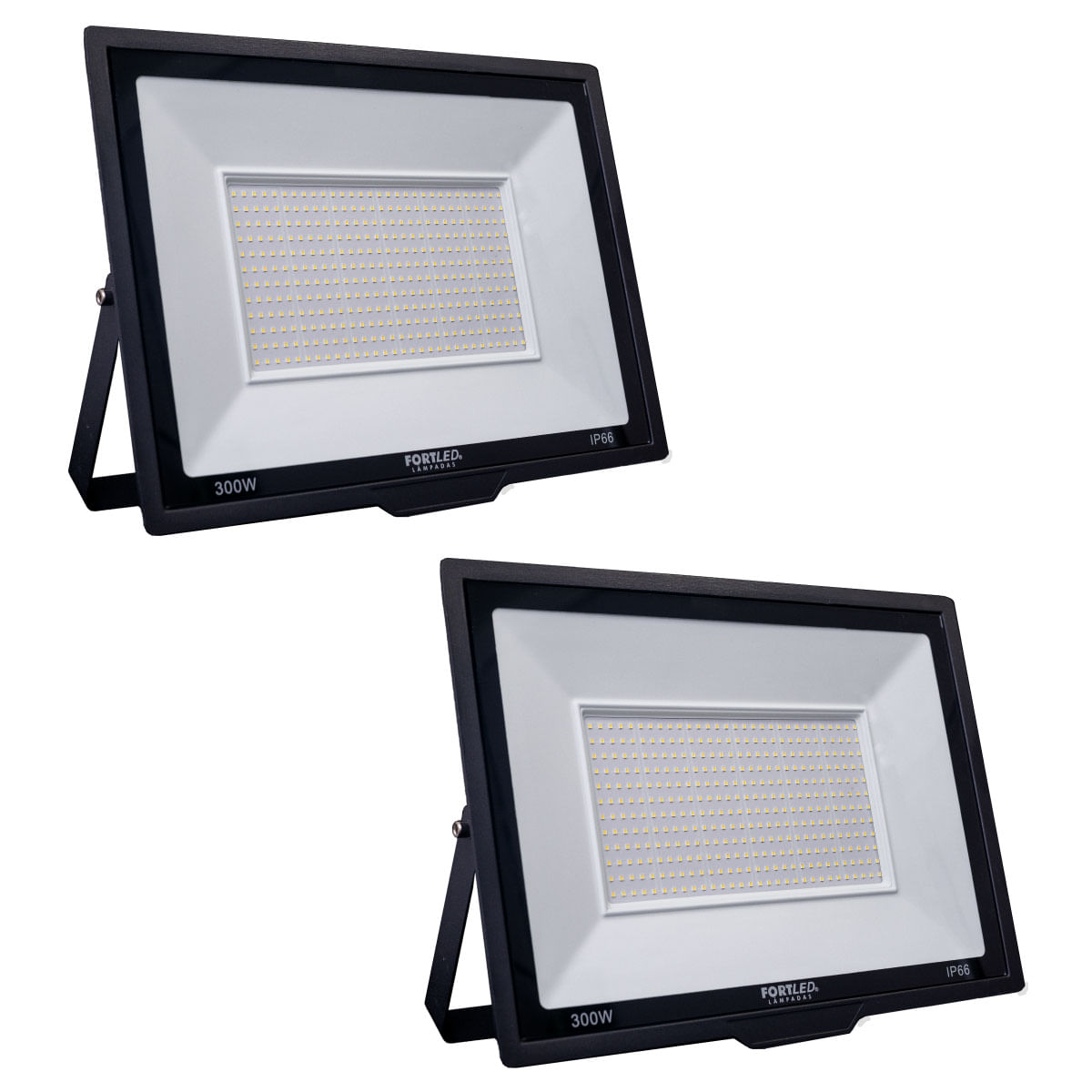 O KIT 2 Refletores de LED 300W Fortled é uma excelente opção para iluminar o exterior da sua casa, desde garagem até jardim! Possuindo o selo de proteção IP66, o Refletor Fortled é totalmente protegido contra a penetração de poeira e a prova de água.