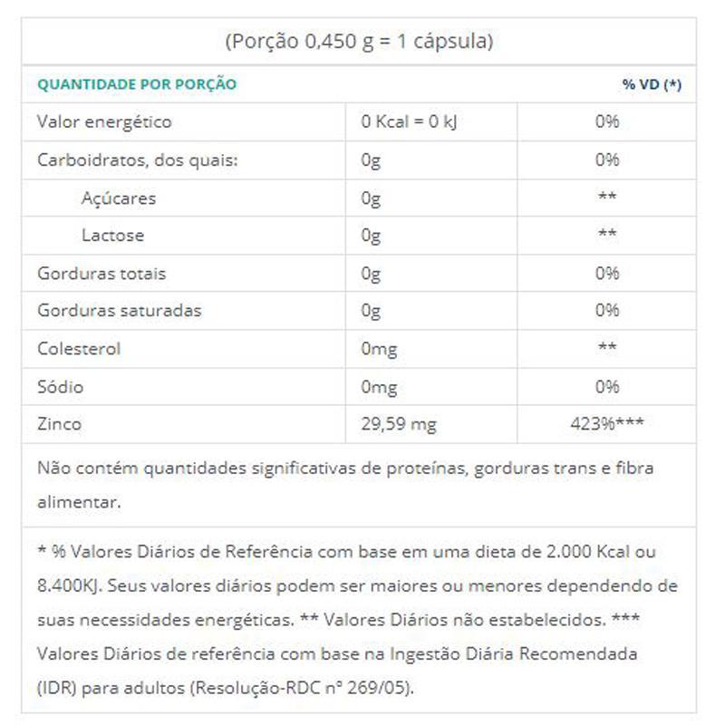 Bisglicinato De Zinco 20% Quelato. Agente De Massa: Celulose Microcristalina (ins 460i), Antiumectantes: Dióxido De Silício (ins 551) E Estearato De Magnésio (ins 470iii). Gelificante: Gelatina (ins 428), E Corantes: Amarelo Crepúsculo (ins 110), Dióxido De Titânio (ins 171), Azul Brilhante (ins 133), Amarelo De Quinoleína (ins 104), Azorrubina (ins 122).