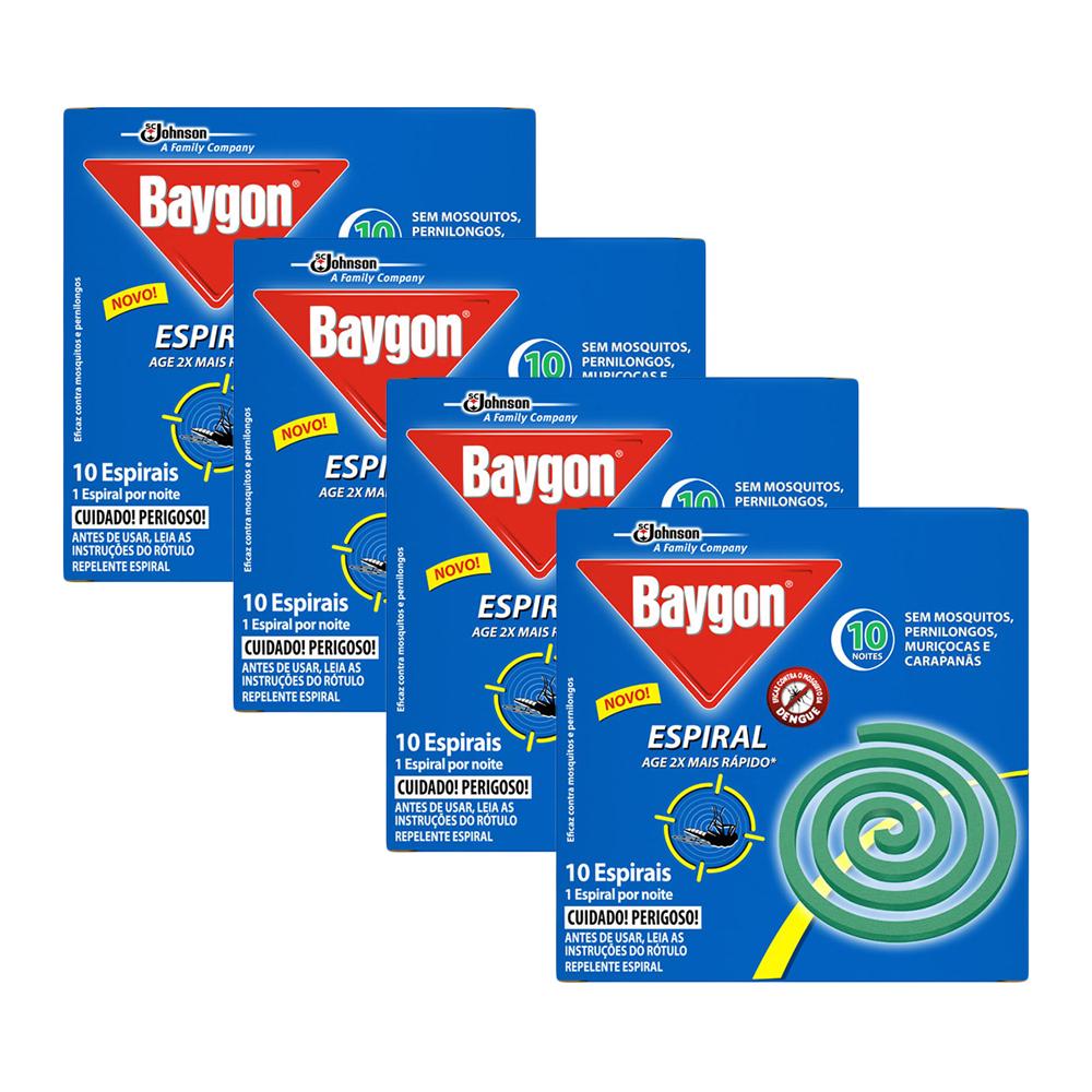 Kit 40 Repelente Espiral BaygonBaygon Espiral fornece a proteção que você precisa para uma boa noite de sono sem o incômodo dos mosquitos Sem mosquitos, pernilongos, muriçocas e carapanãs 40 noites Eficaz contra o mosquito da Dengue Age 2x mais rápidoKit Contém: 4 embalagens Repelente Espiral Baygon com 10 unidades cadaCompre Produtos Baygon
