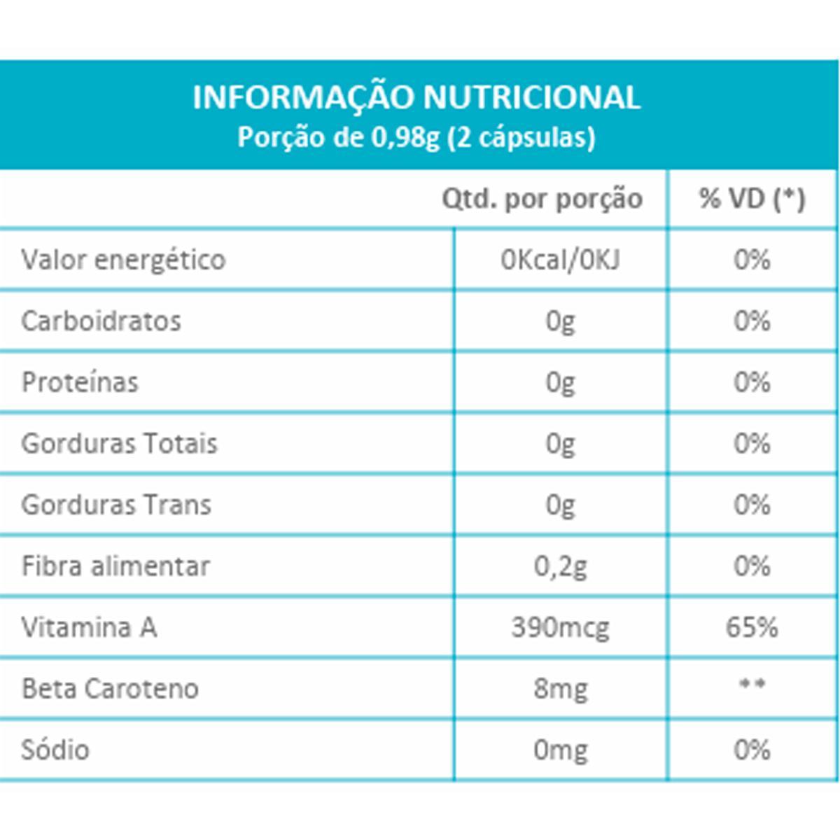 Ingredientes: Betacaroteno, Cenoura, Urucum, Beterraba, Excipiente: Silicato De Magnésio, Antiumectante: Dióxido De Silício, Cápsula: Gelatina.