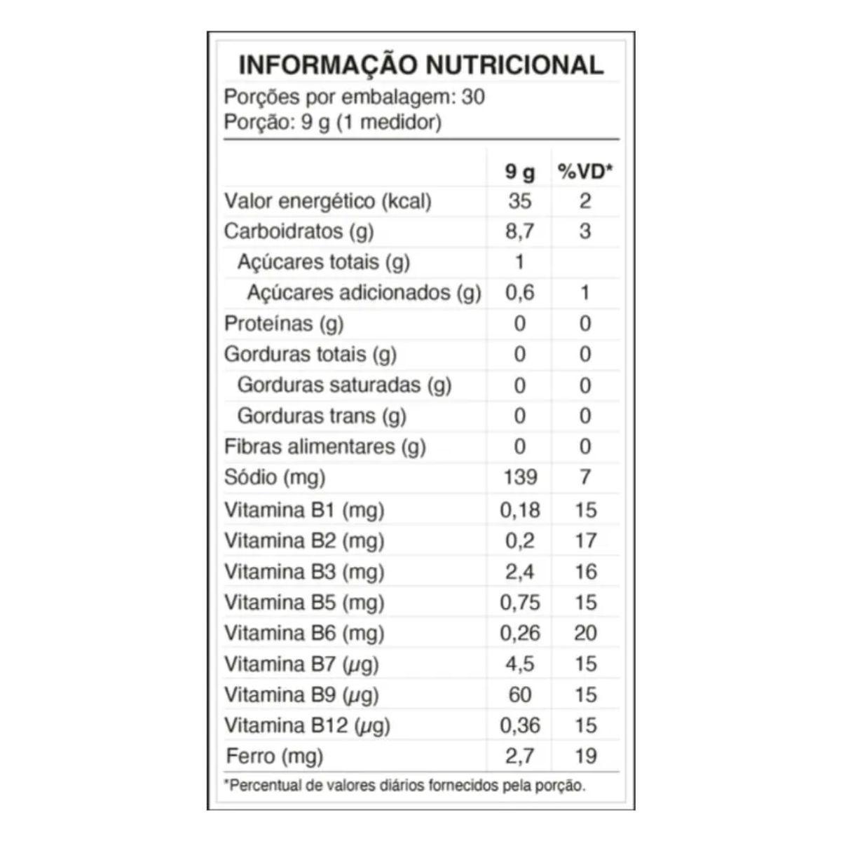 Beterraba Em Pó, Laranja Em Pó, Bisglicinato Ferroso, Tiamina Mononitrato (vitamina B1), Riboflavina (vitamina B2), Cloridrato De Piridoxina (vitamina B6), D-pantotenato De Cálcio (vitamina B5), Nicotinamida (vitamina B3), Ácido Fólico (vitamina B9), D-biotina (vitamina B7), Cianocobalamina (vitamina B12), Acidulante Ácido Cítrico, Antiumectante Fosfato Tricálcico, Aroma Natural E Edulcorante Glicosídeos De Esteviol.