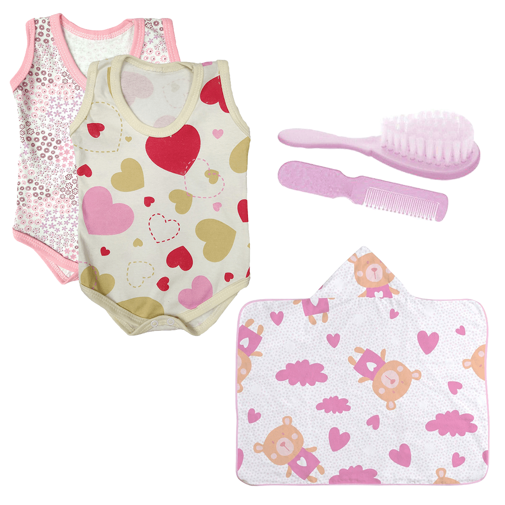 Kit Bebê 5 Peças Body Regata Toalha Capuz e Kit Pente e Escova. . Contém: . 2x Body Regata Estampado. 1x Toalha. 1x Kit Pente e Escova (2 peças). TOTAL= 5 Peças. . ATENÇÃO!. >>>>>AO ESCOLHER ROSA IRÁ CORES E ESTAMPAS SORTIDAS E VARIADAS PARA MENINA, E AO ESCOLHER AZUL IRÁ CORES E ESTAMPAS SORTIDAS E VARIADAS PARA MENINO. >>>>> CORES VARIADAS, MAS, PODENDO HAVER REPETIÇÃO DE COR E/ OU ESTAMPA. >>>>>FÔRMA PEQUENA. >>>>>PODE HAVER DIFERENÇA DE 2 CM PARA MAIS OU PARA MENOS NAS MEDIDAS DO PRODUTO. >>>>>NÃO É PERMITIDO ESCOLHA DE CORES, VAI DE ACORDO COM ESTOQUE. >>>>>BODYS EM SUEDINE E MIJÕES EM ALGODÃO. >>>>>NÃO TEMOS KITS UNISSEX. >>>>>FOTO ILUSTRATIVA. >>>>>OS KITS SERÃO ENVIADOS COM CORES E ESTAMPAS DISPONÍVEIS EM ESTOQUE, PODENDO SER OU NÃO IGUAIS AS ANUNCIADAS. >>>>>O KIT NÃO VAI FAZENDO CONJUNTO COM CORES COMBINANDO. . BODY REGATA. TAM P: COMPRIMENTO: 32cm | CINTURA: 20cm . TAM M: COMPRIMENTO: 34cm | CINTURA: 22cm. . TAM G: COMPRIMENTO: 36cm | CINTURA: 24cm. . ESPECIFICAÇÕES: Elaboramos um Kit, pensando em facilitar a organização da mala de nossos bebês. O kit trás 5 peças em bodys de suedine 100% algodão. Confortável, macio e durável, com lindas estampas. Deixando o dia a dia das mamães mais tranquilo e organizado. OUTRAS INFORMAÇÕES IMPORTANTES: - Produto NOVO e a pronta entrega, - Tire todas as suas dúvidas pelo campo de perguntas e respostas, - O produto será enviado em até 24hs úteis, - Garantimos a entrega do produto ou seu dinheiro de volta, - Em caso de troca ou devolução as despesas com envio e reenvio serão por conta do comprador