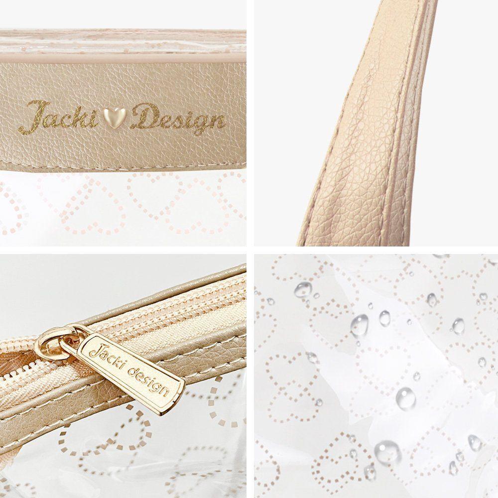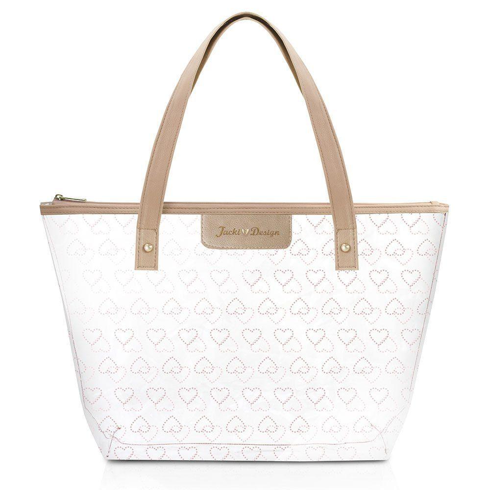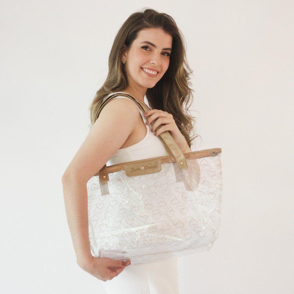 Design Moderno E Toque Feminino, A Bolsa Shopper Transparente Da Coleção Love É Feita Em PVC Resistente, Impermeável E Fácil De Limpar. Destaque Para Os Detalhes Em Formato De Coração E O Pin Dourado Com A Assinatura Jacki Design. Possui Amplo Espaço Interno E Fechamento Em Zíper, Ideal Para O Dia A Dia, Praia Ou Piscina.