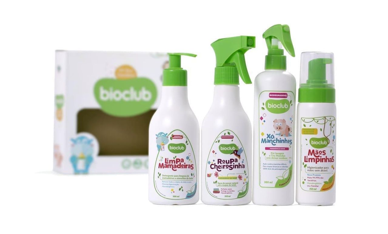 O Kit Box Saudável Da Bioclub Contém 4 Produtos: 1 Roupa Cheirosinha, 1 Limpa Mamadeiras, 1 Mãos Limpinhas E 1 Xô Manchinhas.