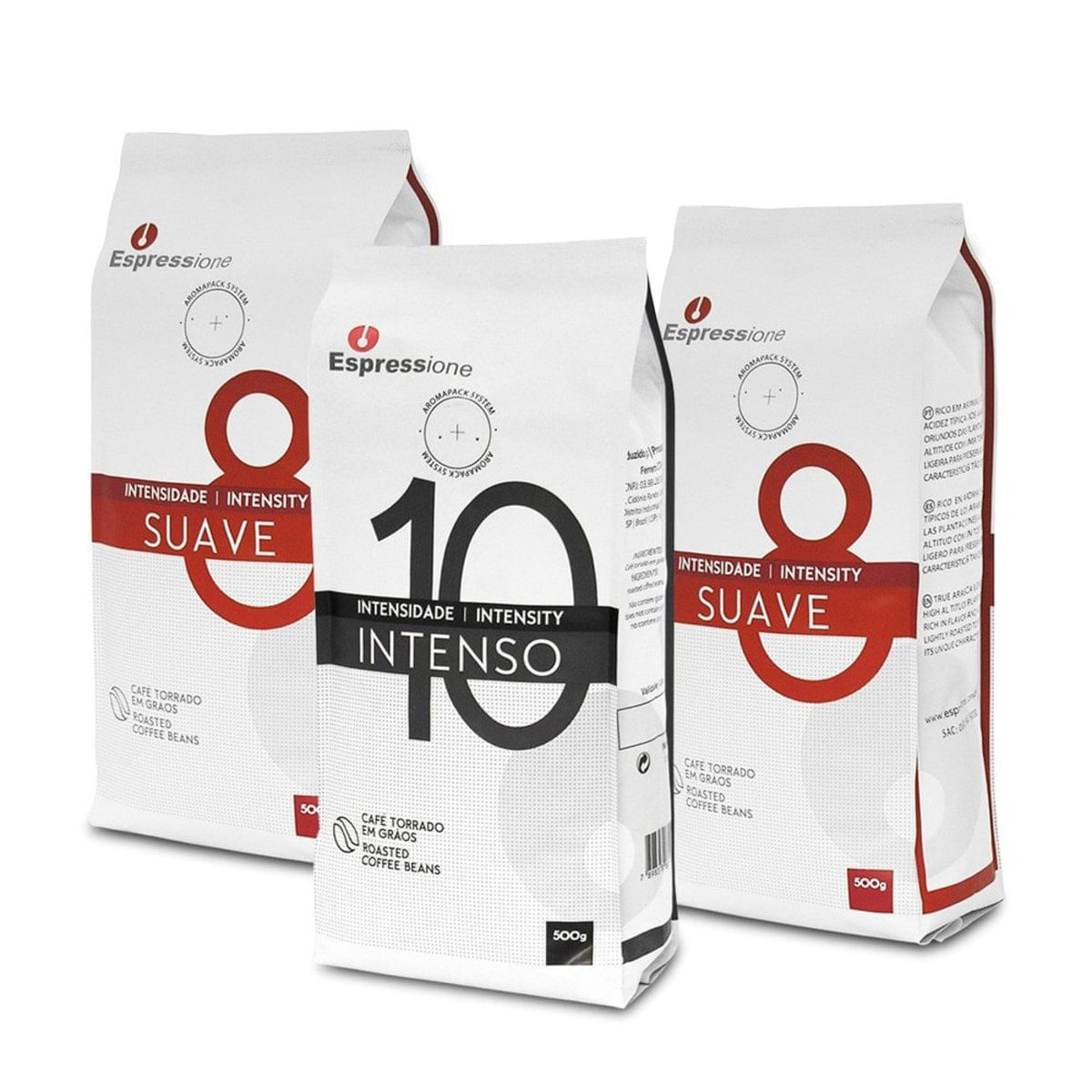 Conhecida por suas máquinas de café, a Espressione entrou com força total também na comercialização da famosa bebida. Este kit contém dois modelos Suave Intensidade 8 e uma opção do modelo Intenso Intensidade 10, ricos em aromas e com acidez típica dos arábicas.