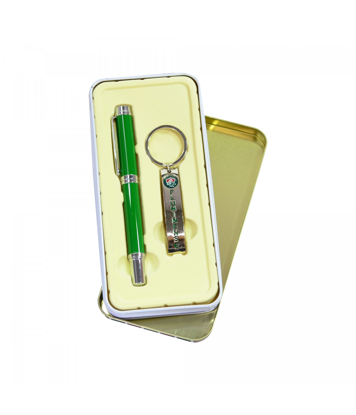 Olha Que Incrível! Jogo Que Vem Com Uma Linda Caneta De Metal Com Tampa E Um Chaveiro Que É Abridor De Garrafas. Os Dois Itens Vêm Customizados Com Brasão E Marca, E Dentro De Uma Lata Também Toda Customizada Nas Cores Do Seu Time De Coração, Prontos Para Servir De Presente. Material, Metal.
