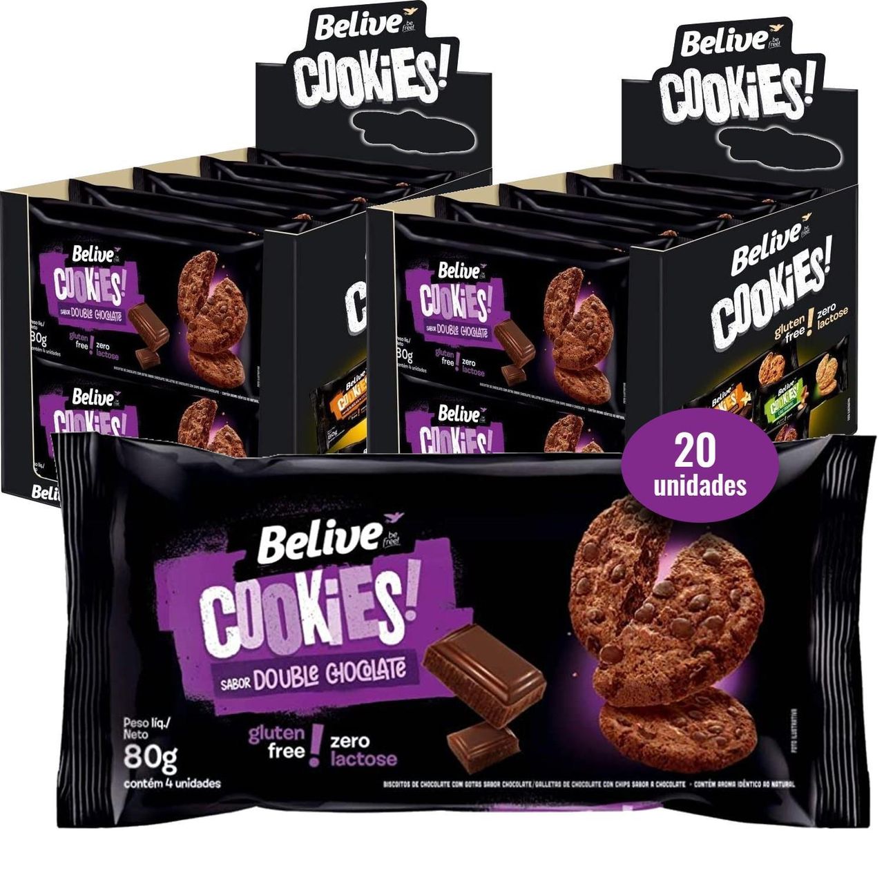 Kit Com 20 Unidades De Cookie Belive Double Chocolate Zero Glúten, Zero Lactose, 80g Cada.