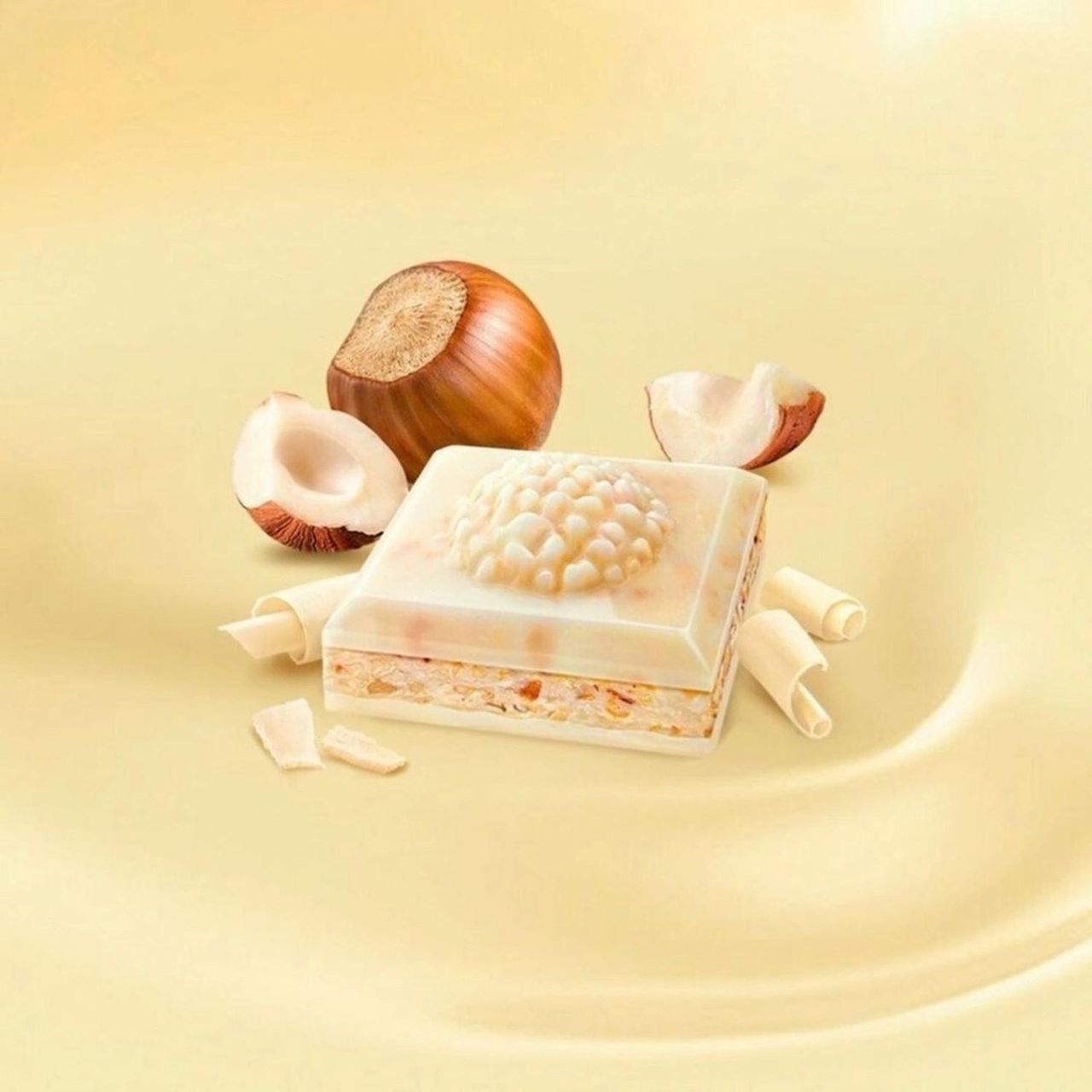Chocolate Branco (60%) (manteiga De Cacau, Açúcar, Leite Desnatado Em Pó, Soro De Leite Em Pó, Gordura Anidra De Leite, Emulsificante Lecitinas, Aromatizante), Avelãs (13,5%), Gordura Vegetal, Açúcar, Leite Desnatado Em Pó, Leite Em Pó, Emulsificante Lecitinas, Aromatizantes.