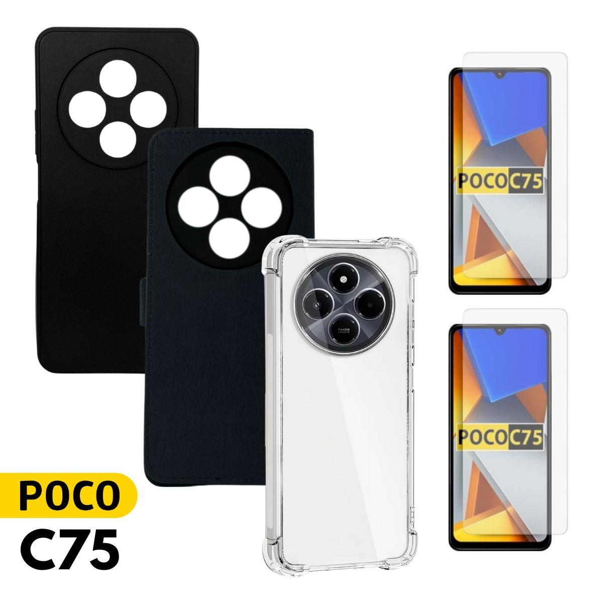Kit Completo Para Poco C75 Carteira + Capa Preta + Transparente + 2 Películas 3d