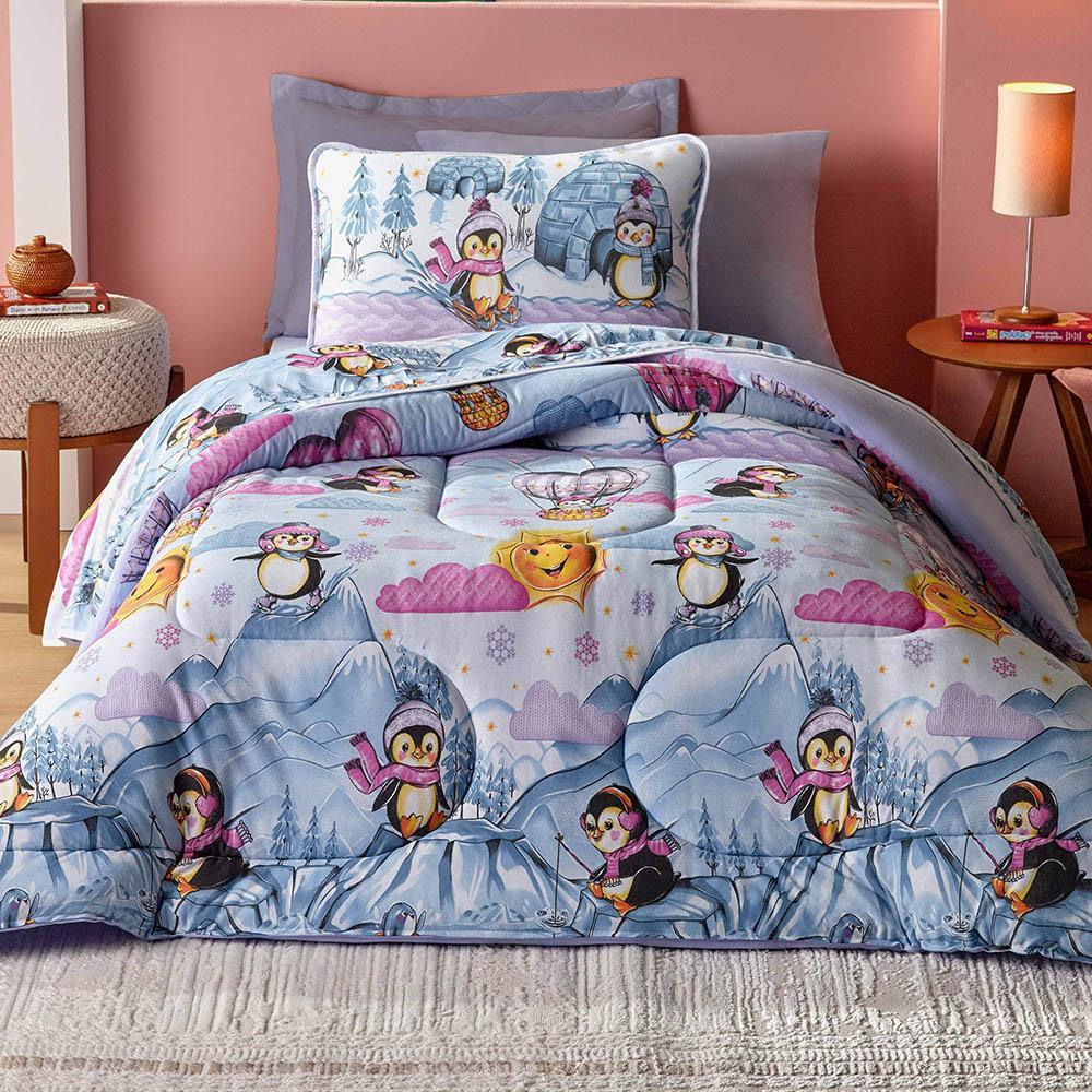 Kit Coordenado Edredom Com Lençol Solteiro Mymo - Pinguim - 100% Algodão