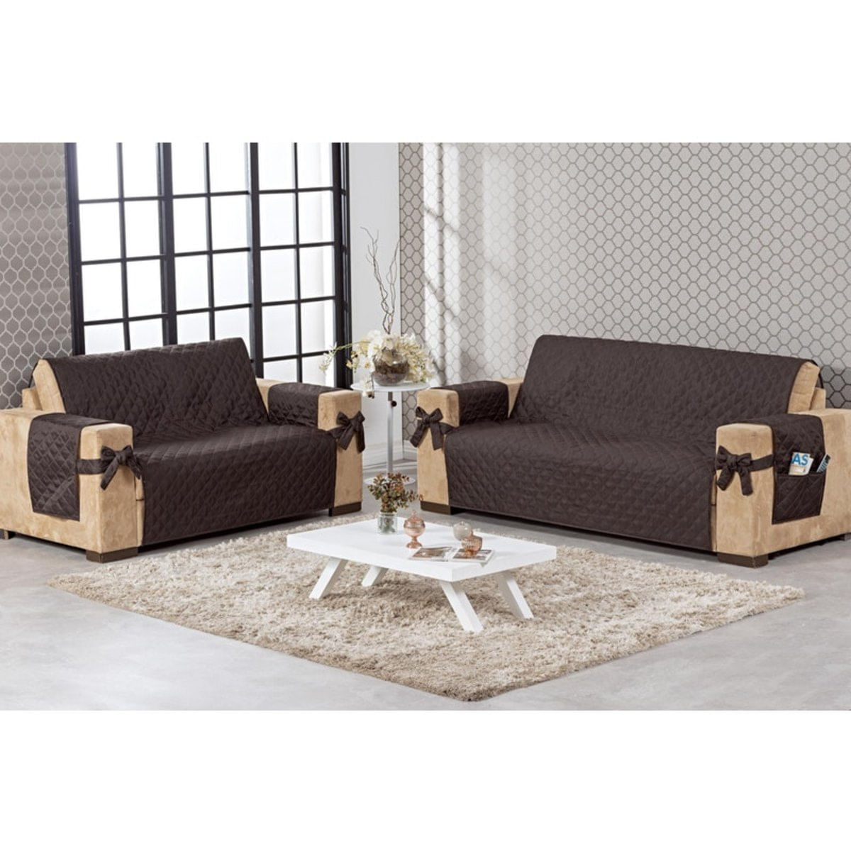 Protetor de sofá 2 e 3 lugares face única com laço..O kit capa para sofá é feito para diversos tipos de sofá, é ideal para você decorar a sua sala para que você receba sua visita em um ambiente mais bonito e agradável, além de proteger o seu sofá de manchas, sujeiras e outro tipo de dano que possa ser causado com o tempo...Contém:..01 protetor de sofá para 2 lugares 1,90m x 1,00m..01 protetor de sofá para 3 lugares 1,90m x 1,50m..Medida dos 4 protetores para braço: 0,75cm x 0,48cm..Composição:..Tecido: 100% poliéster.Enchimento: 100% poliéster.Forro: tnt gramatura 20..Detalhe do laço: todo matelado..Fabricação própria