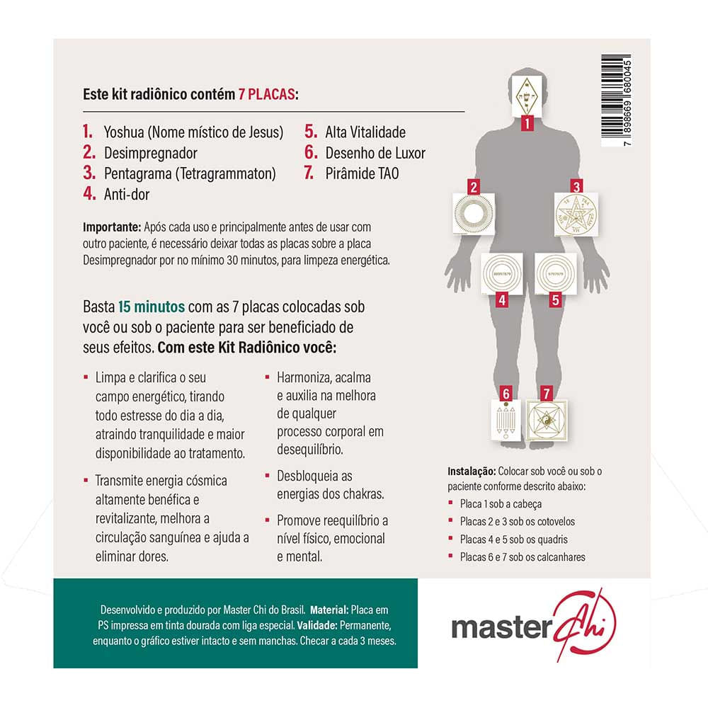 Kit de Placas Radiônicas para Tratamento | Maca - Terapeutas Descrição: O Kit Radiônico para Maca é altamente recomendado para tratamentos com as placas sob a maca ou sob a pessoa. Bastam 15 minutos para ser beneficiado de seus efeitos. Esse conjunto lhe protegerá de energias nocivas dos nós da rede Hartmann, dos veios telúricos ou outro foco natural de energias nocivas. Protege de agressões espirituais e psíquicas emanadas por nós ou por terceiros. Trata dores e restabelece a energia vital. Transmite energia cósmica altamente benéfica e revitalizante. O Kit Maca é composto por sete placas que são: 1- Nome Mistico de Jesus (Yoshua) 5- Alta Vitalidade 2- Desimpregnador 6- Desenho de Luxor 3- Pentagrama 7- Pirâmide TAO. 4- Anti Dor Especificações: Instalação: Colocar sob a maca conforme descrito abaixo: Placa 1 na altura da cabeça Placas 2 e 3 na altura dos cotovelos Placas 4 e 5 na altura dos quadris Placas 6 e 7 na altura dos pés. (conforme imagem do kit) Ou sob a pessoa na maca, cama, chão ou qualquer outro lugar. Seus benefícios serão: - Aceleram os efeitos de qualquer outro método terapêutico que for utilizado em conjunto com este kit - Faz desbloqueio de energias e de chakras. Tudo flui melhor - Harmoniza, acalma e auxilia na melhora de qualquer processo corporal em desequilíbrio. Cuidados: Checar as placas de três em três meses para verificar se não há manchas. Caso haja, é sinal da proteção feita pela placa. Substitua a placa manchada imediatamente. Dados Técnicos: Dimensões: 1- Nome Mistico de Jesus (Yoshua) 14,0 x 10,0 (cm) 5- Alta Vitalidade 14,0 x 14,0 (cm) 2- Desimpregnador 14,0 x 14,0 (cm) 6- Desenho de Luxor 14,0 x 10,0 (cm) 3- Pentagrama 14,0 x 14,0 (cm) 7- Pirâmide TAO 14,0 x 14,0 (cm). 4- Anti Dor 14,0 x 14,0 (cm) Material: Placa em PS impressa em tinta dourada com liga especial. Duração: Validade permanente enquanto estiver intacto o gráfico e sem manchas.