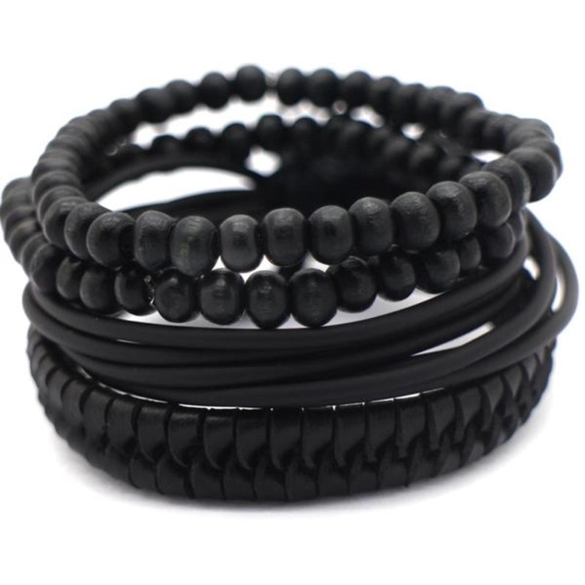 Kit de Pulseiras Universo Maschio Cód. 05077..Características: ..Esse Kit contém 4 pulseiras...2 pulseiras de couro sintético preto ajustável 16-23cm...2 pulseiras de madeira preto 6mm .