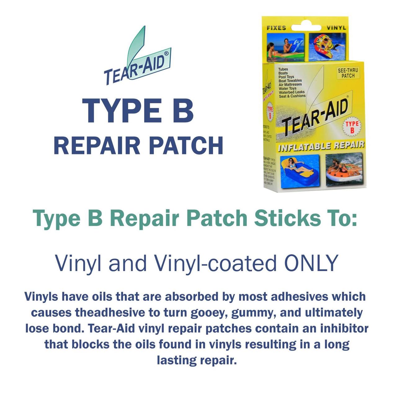 - O Adesivo De Reparo De Vinil Tear-aid Tipo B Adere Apenas A Material Revestido De Vinil E Vinil. O Vinil Tem Óleos Que São Absorvidos Pela Maioria Dos Adesivos, O Que Faz Com Que O Adesivo Fique Pegajoso, Pegajoso E, Finalmente, Perca A Colagem. Os Adesivos De Reparo De Vinil Tear-aid Contêm Um Inibidor Que Bloqueia Os Óleos Encontrados No Vinil, Resultando Em Um Reparo De Longa Duração