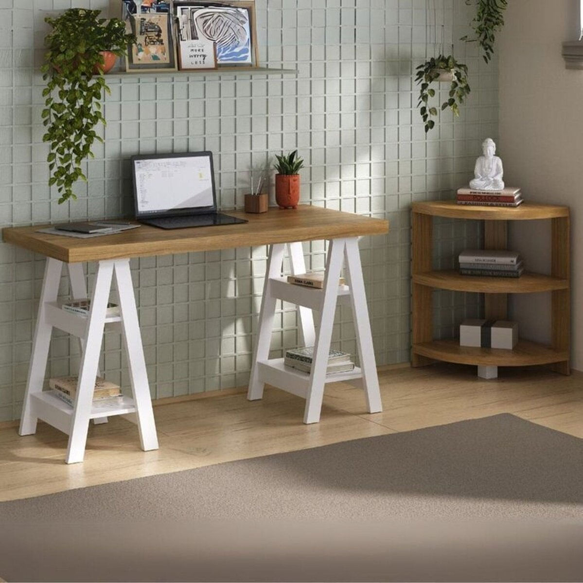 Este Lindo Conjunto Para Home Office Ou Escritório Combina Leveza, Elegância E Funcionalidade Em Um Design Que Valoriza Cada Detalhe. A Escrivaninha Com Base Em Cavaletes Oferece Um Visual Moderno E Despojado, Com Prateleiras Laterais Que Garantem Praticidade E Espaço Para Organizar Livros E Objetos De Uso Diário. A Estante Baixa De Canto Complementa O Conjunto Com Harmonia, Aproveitando O Ambiente De Forma Inteligente E Adicionando Um Toque De Sofisticação. Com Acabamento Amadeirado E Branco E Estrutura De Alta Qualidade, O Conjunto Une Beleza, Resistência E Estilo, Tornando O Espaço De Trabalho Ou Estudo Muito Mais Agradável E Inspirador.