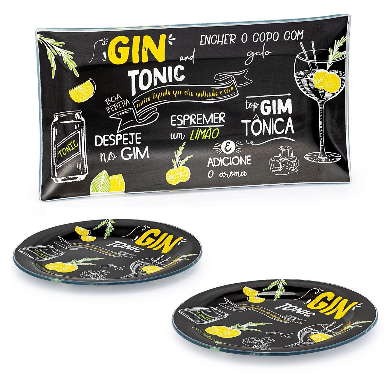 Jogo Com Uma Travessa De Vidro Retangular E Dois Pratos Rasos De Vidro Decorados Com Tema De Gin.