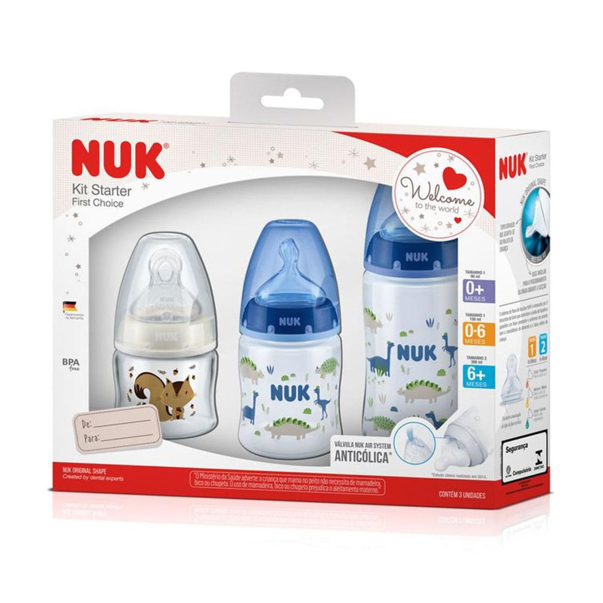Kit Mamadeiras Starter NUK First Choice Boy.ATENÇÃO: Imagem meramente ilustrativa. Todas as informações divulgadas são de responsabilidade do fabricante/fornecedor. As cores podem sofrer variações de acordo com o tipo, configuração e resolução do seu monitor. O Ministério da Saúde adverte: O aleitamento materno evita infecções e alergias e é recomendado até os dois anos de idade ou mais. O Ministério da Saúde adverte: Após os seis meses de idade continue amamentando seu filho e ofereça novos alimentos.