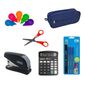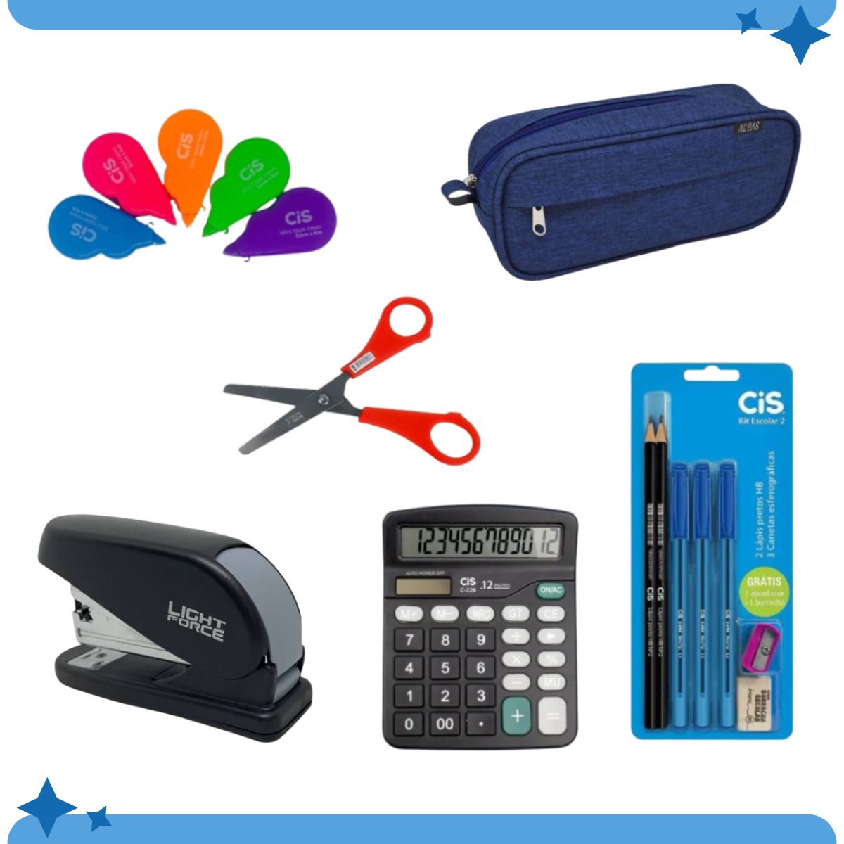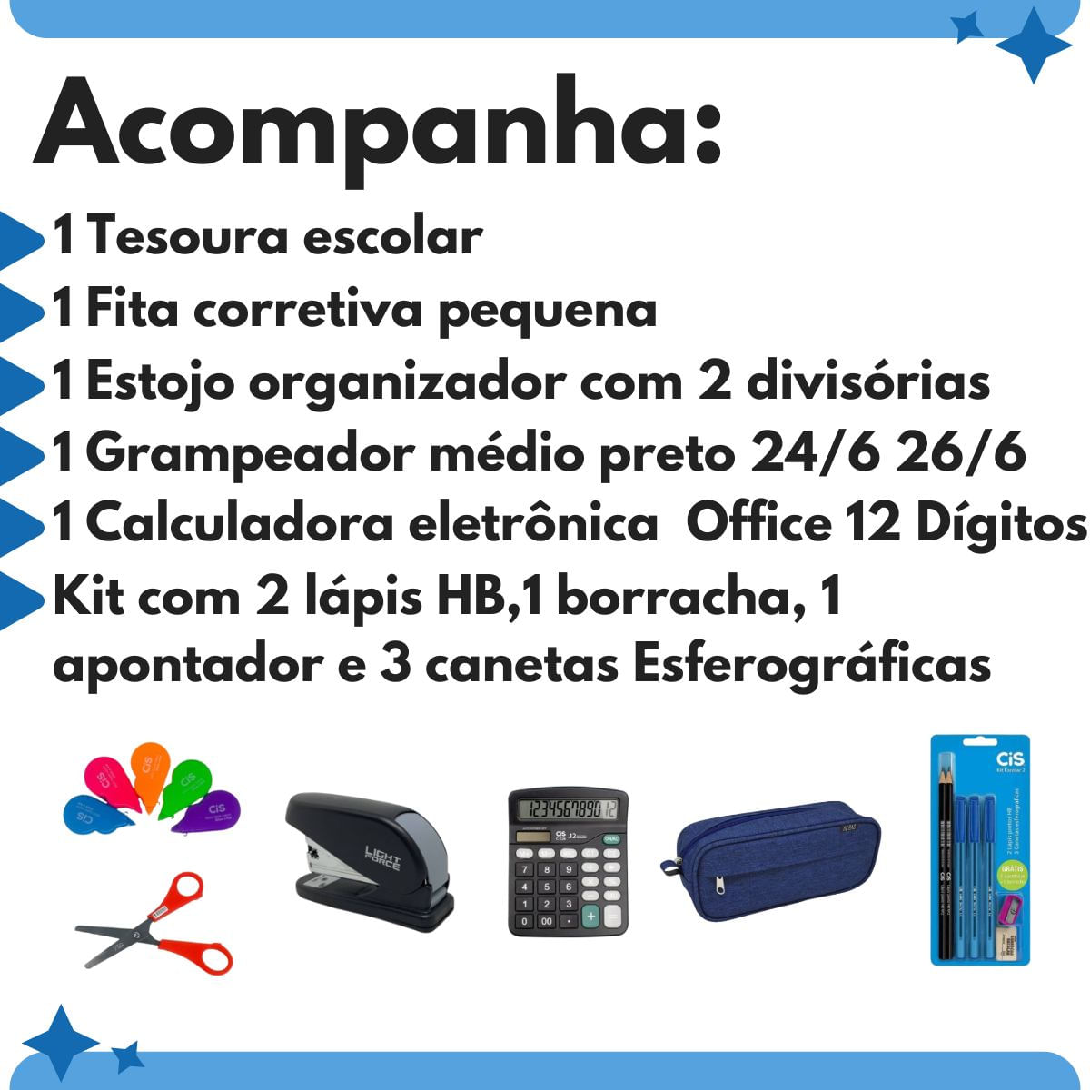 Kit Material Escolar 12 Itens Aluno Com Calculadora, Tesoura, Lápis, Borracha, Apontador, Caneta, Fita Corretiva E Estojo