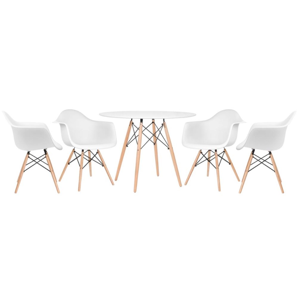 CADEIRAS: Material do assento: Polipropileno - Material da base: Madeira e aço - Altura do encosto: 79,5 cm - Altura do assento: 44 cm - Altura dos braços: 67 cm - Largura total: 62 cm - Profundidade total: 62 cm - Peso suportado: 100 kg.MESA:Material do tampo: MDF laqueado - Material da base: Madeira e aço - Altura: 75 cm - Diâmetro: 100 cm - Garantia: 3 meses.