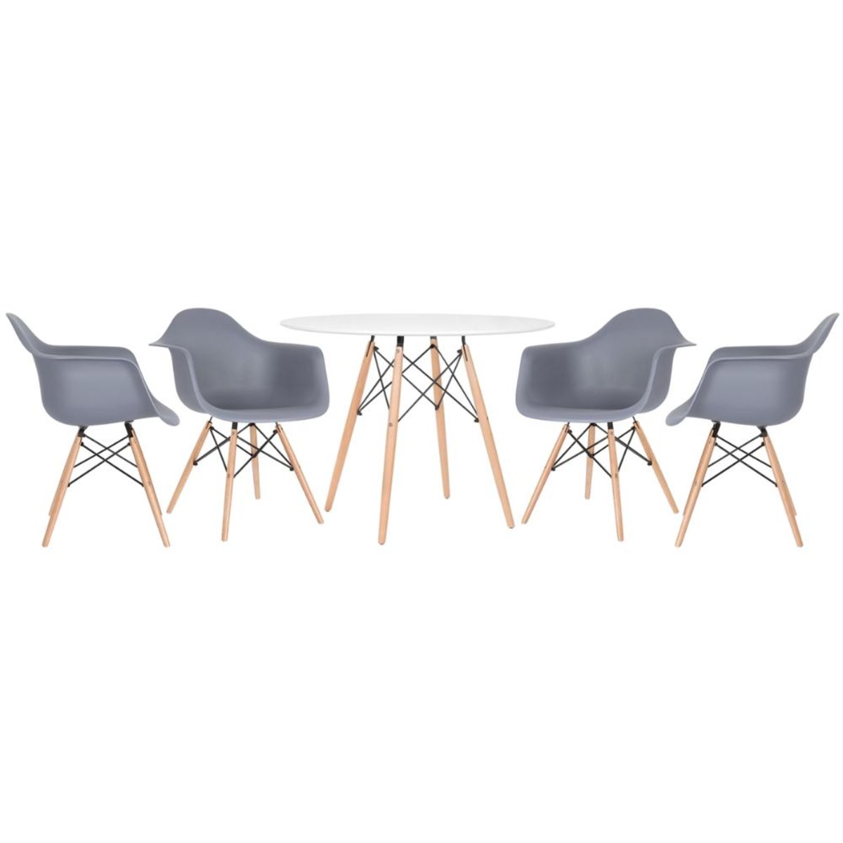 CADEIRAS: Material do assento: Polipropileno - Material da base: Madeira e aço - Altura do encosto: 79,5 cm - Altura do assento: 44 cm - Altura dos braços: 67 cm - Largura total: 62 cm - Profundidade total: 62 cm - Peso suportado: 100 kg.MESA:Material do tampo: MDF laqueado - Material da base: Madeira e aço - Altura: 75 cm - Diâmetro: 100 cm - Garantia: 3 meses.